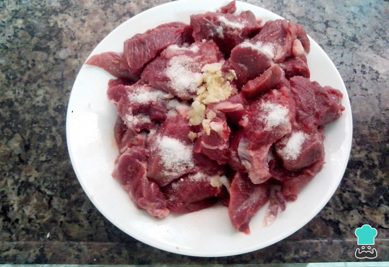 O primeiro passo desta receita de carne na panela de pressão é temperar a carne com o alho, a cebola em pó, páprica e sal.