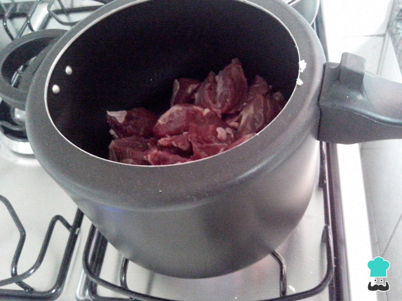 Em uma panela de pressão coloque o azeite e refogue a carne até dourar. Adicione meia xícara de água, feche a panela e cozinhe por 25 minutos.