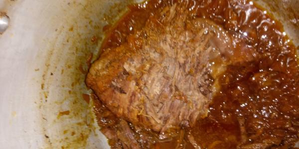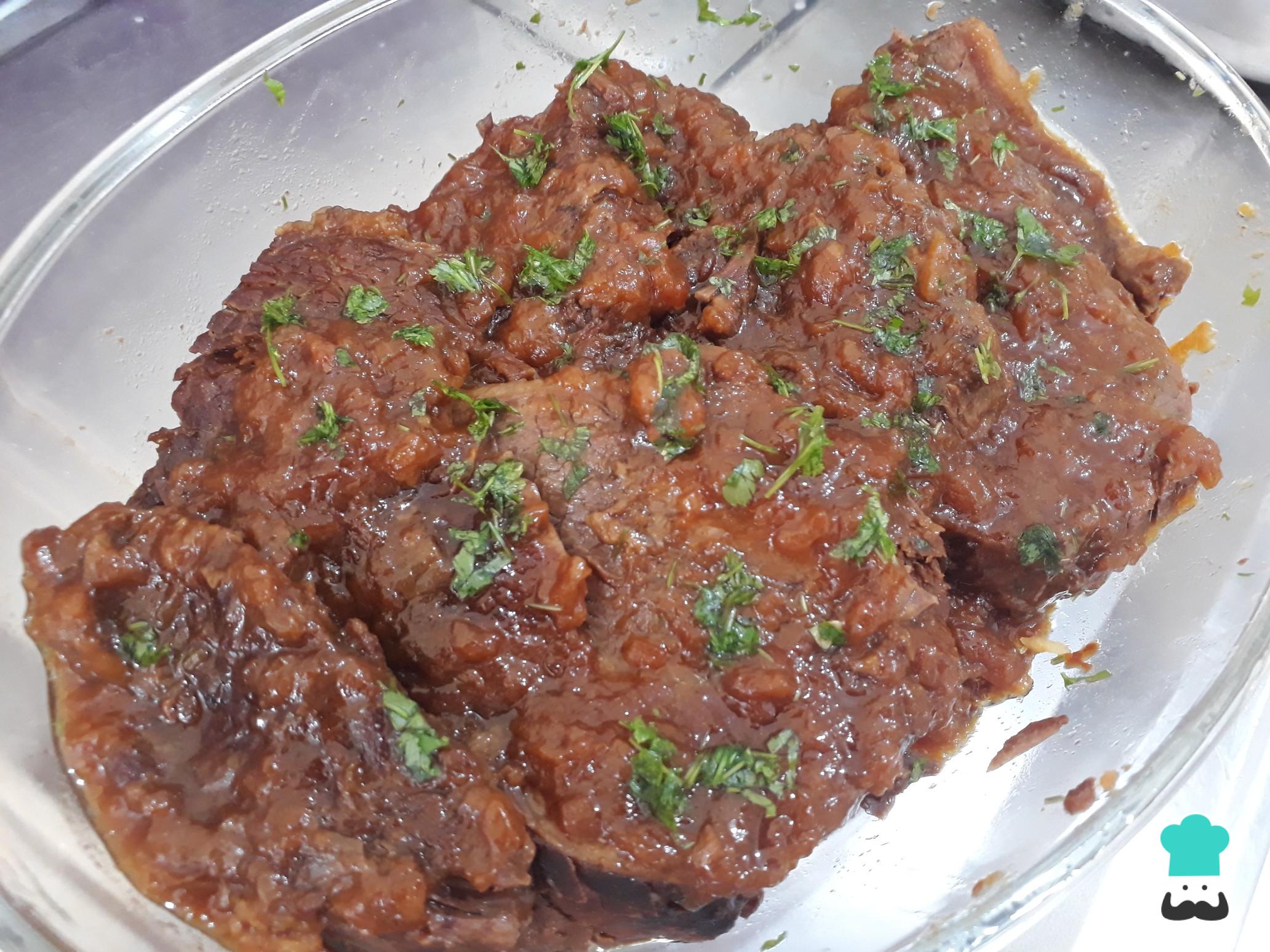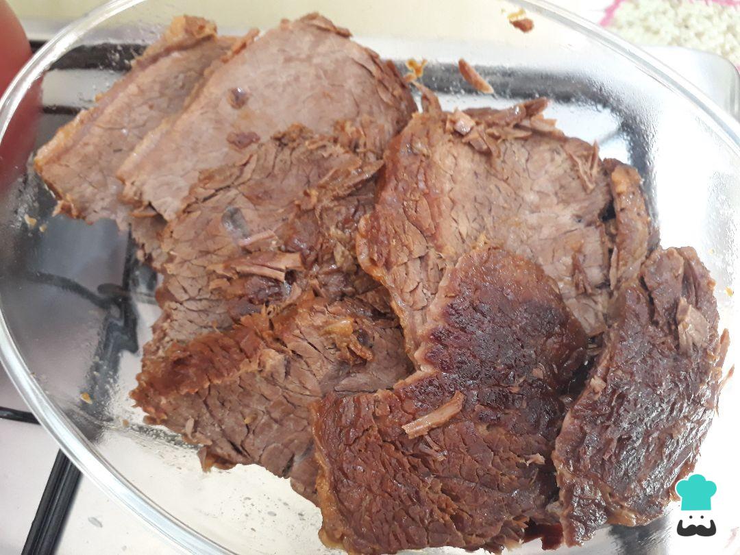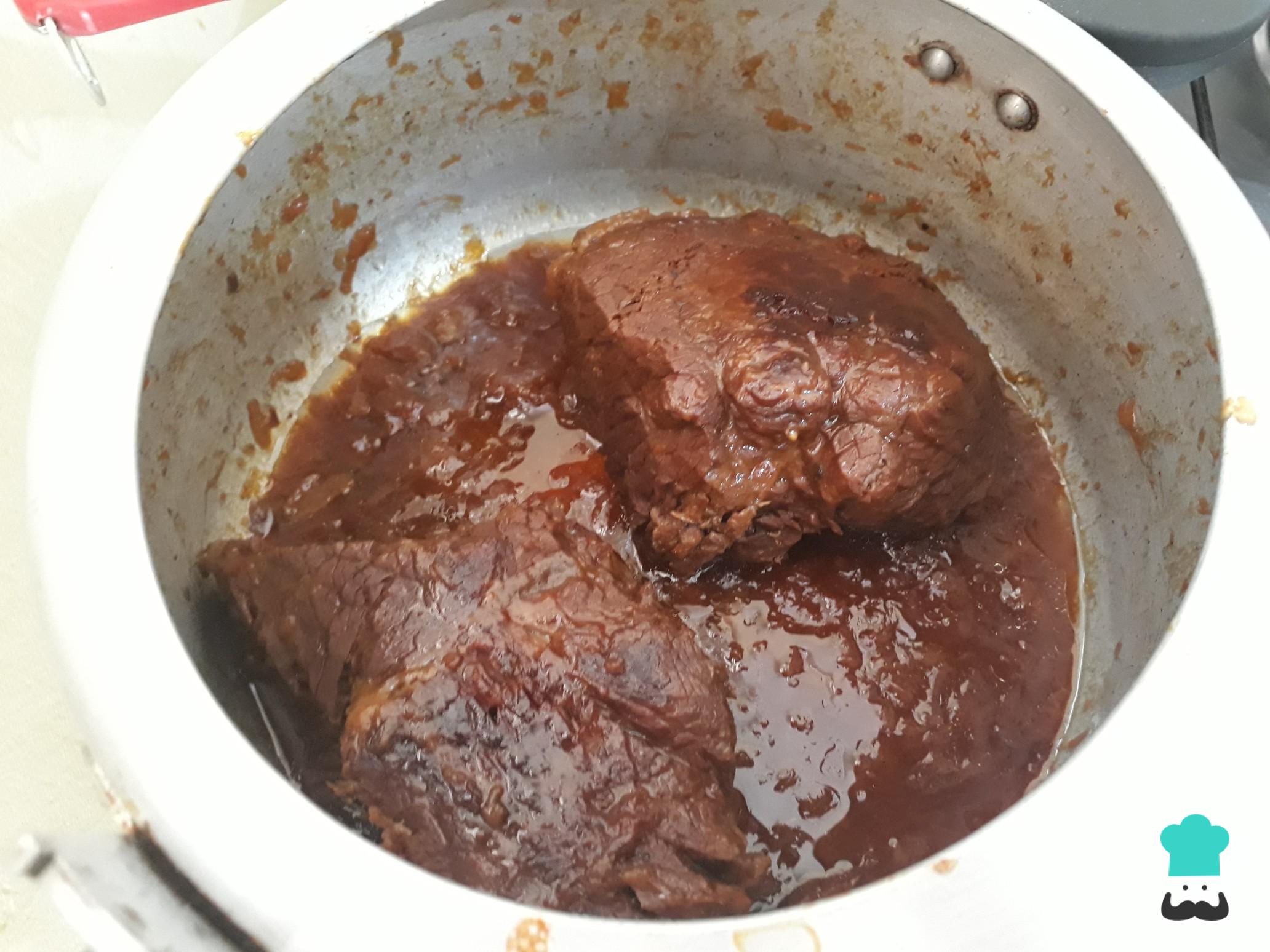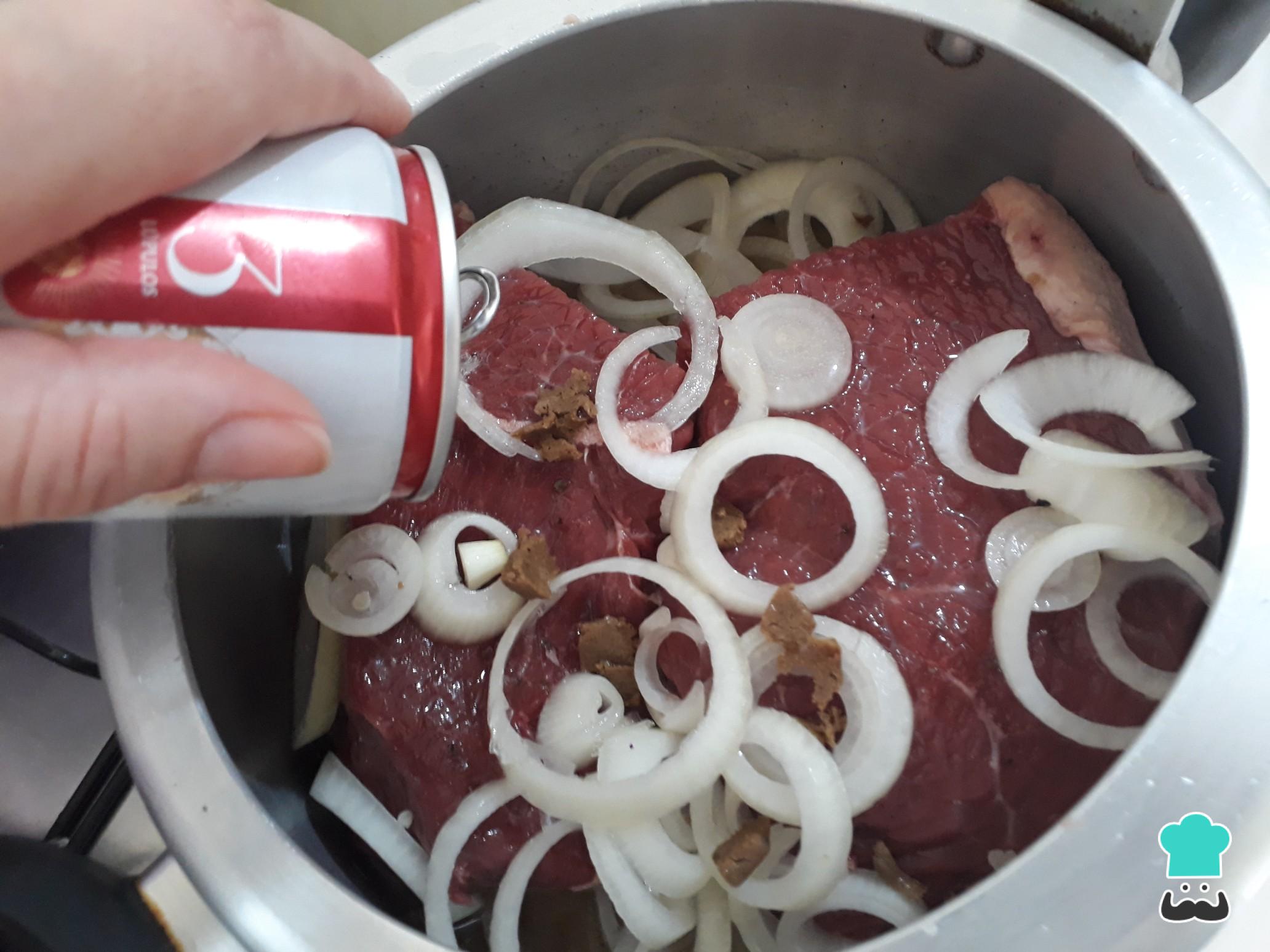 Após o tempo do cozimento indicado a carne estará pronta, bem dourada e com um molho de carne de panela formado com a cerveja e a cebola.