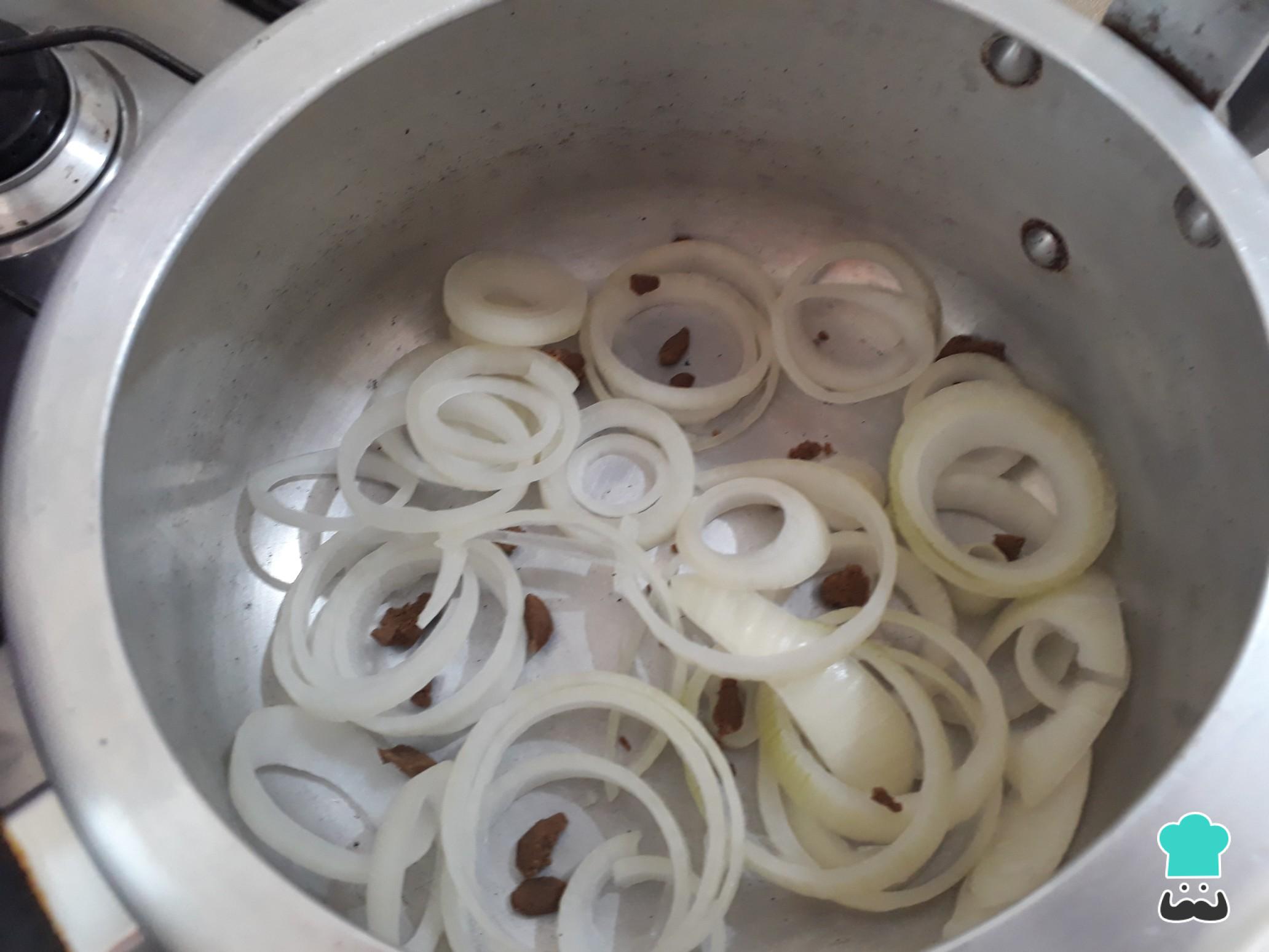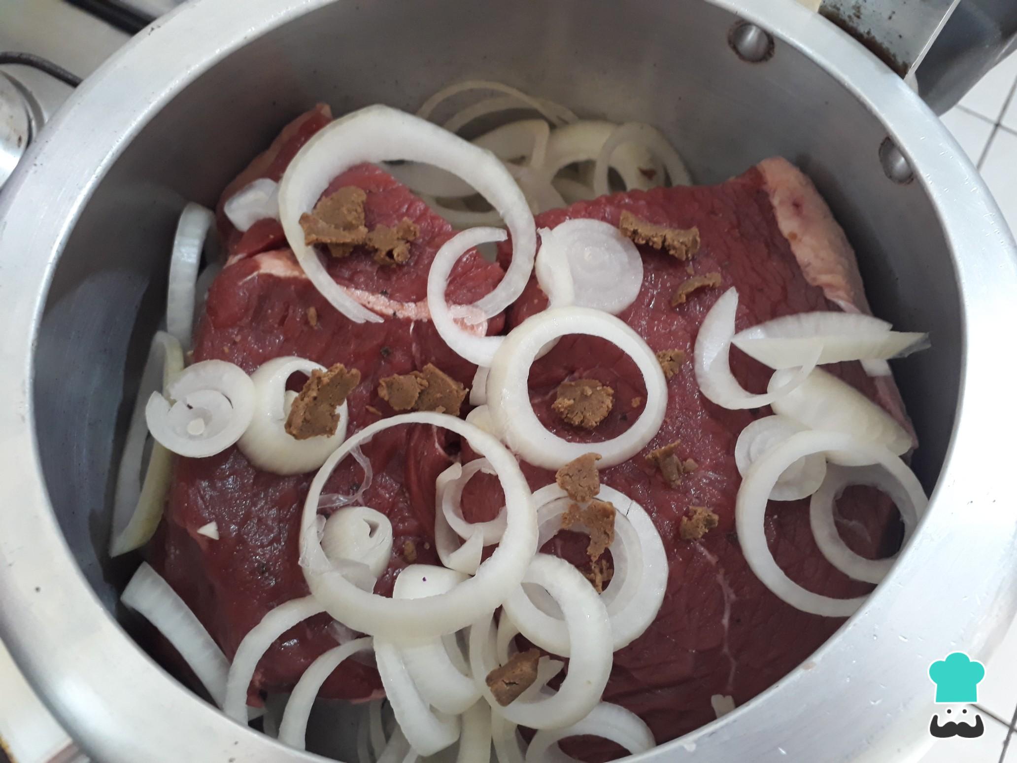 Corte as cebolas em rodelas grossas. Em uma panela de pressão faça uma cama com metade das cebolas e, por cima, coloque metade do caldo de carne em pedacinhos, como mostra a imagem.