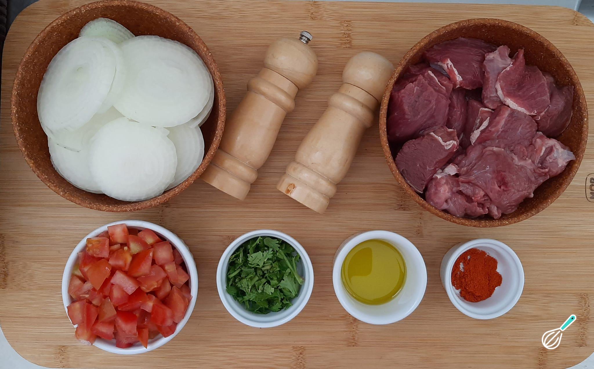 Separe os ingredientes necessários para preparar a nossa receita de carne de panela de pressão sem água. Utilize outros cortes de carnes se preferir, como músculo, costela, paleta...