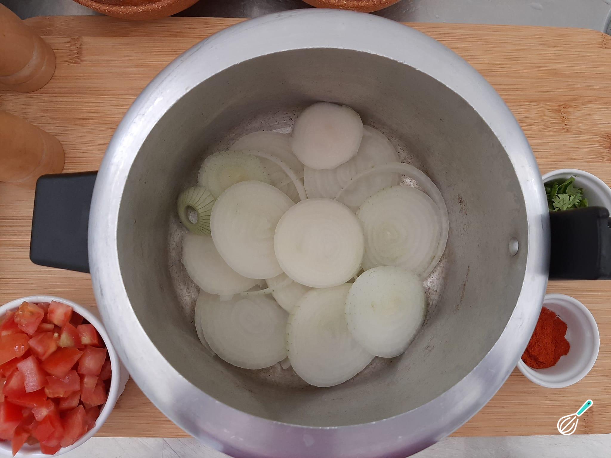 Numa panela de pressão pequena, preencha o fundo com azeite de oliva e cubra com as rodelas de cebola.