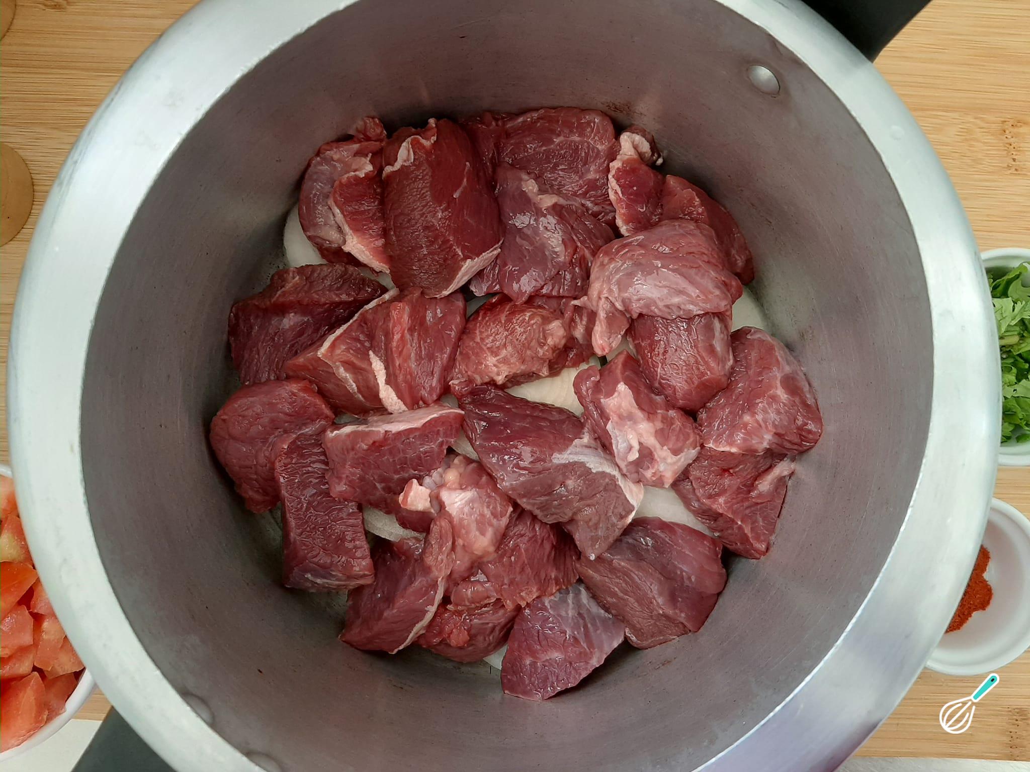 Acomode os pedaços de carne sobre as cebolas, sem precisar refogar nada nem levar no fogo nesse momento.