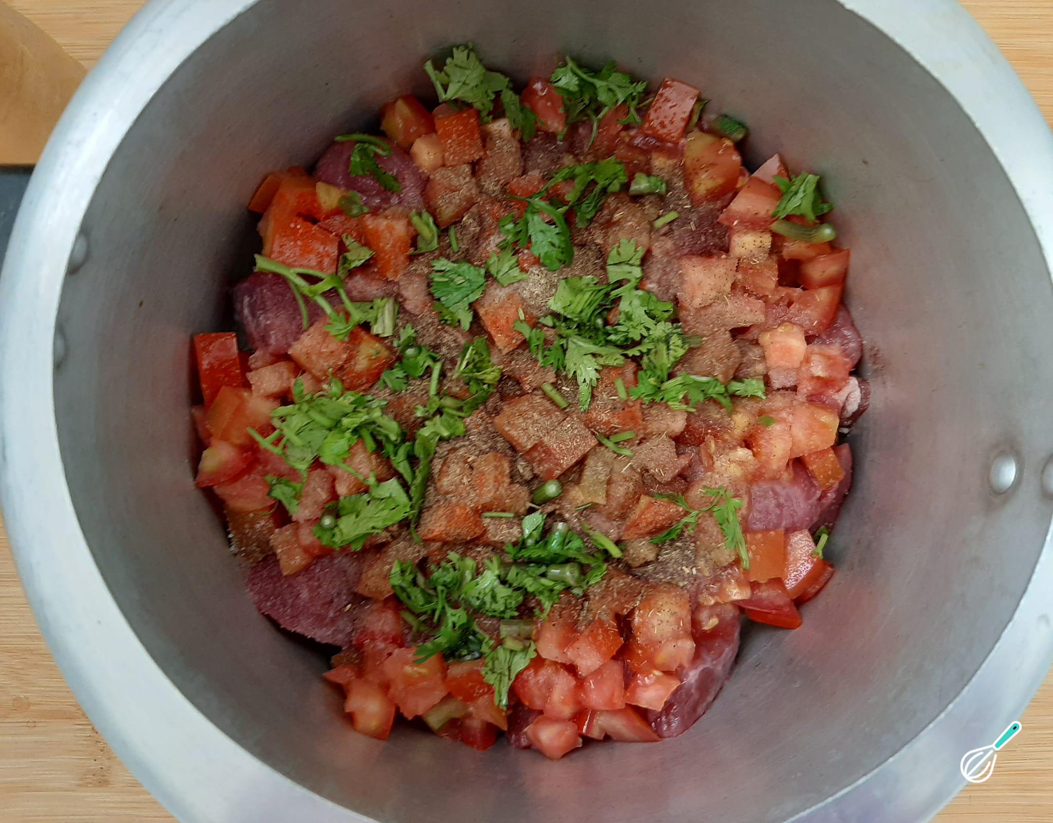 Finalize com coentro ou cheiro verde picados e, sem adicionar água nem qualquer outro tipo de líquido, feche a panela de pressão. Leve para cozinhar por 30 minutos a partir do momento que pegar a pressão, em fogo baixo.