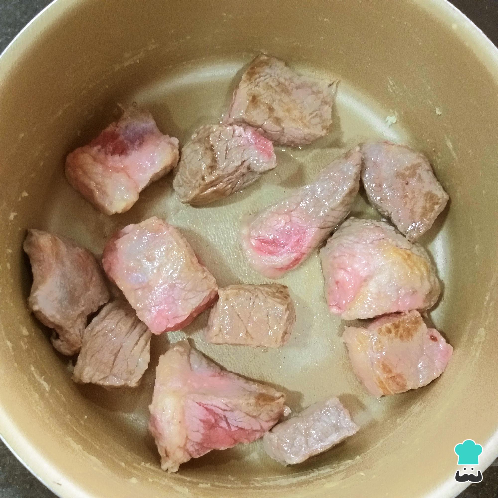 Leve uma panela comum ao fogo médio e acrescente o óleo. Quando o óleo esquentar, adicione a carne picada em cubos médios e frite até a carne dourar de todos os lados - a esse processo se chama 'selar a carne' e garante uma maior suculência e sabor!