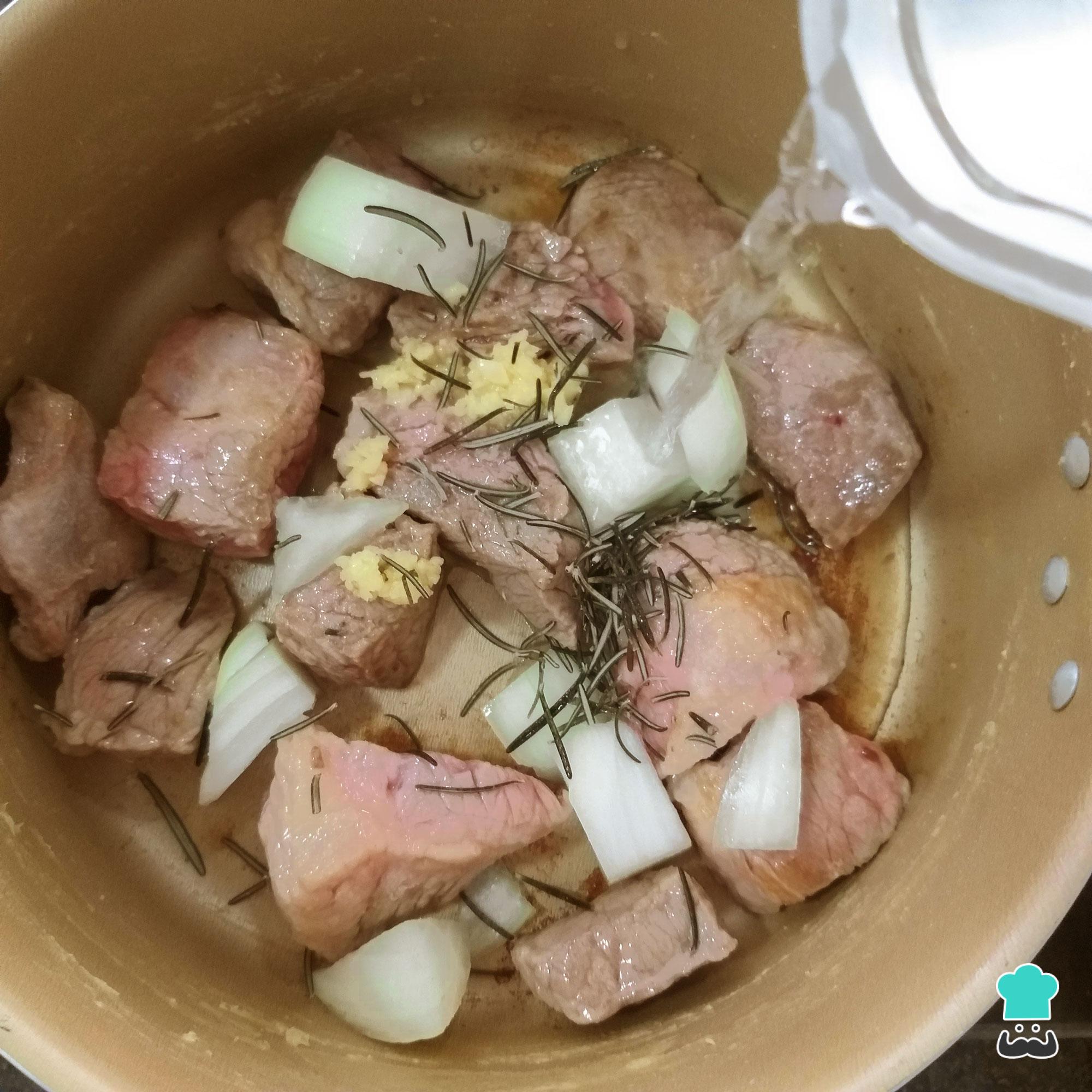 Em seguida acrescente a cebola, o alho, o alecrim e a água. Tampe a panela e cozinhe por 30 minutos ou até a carne ficar macia.