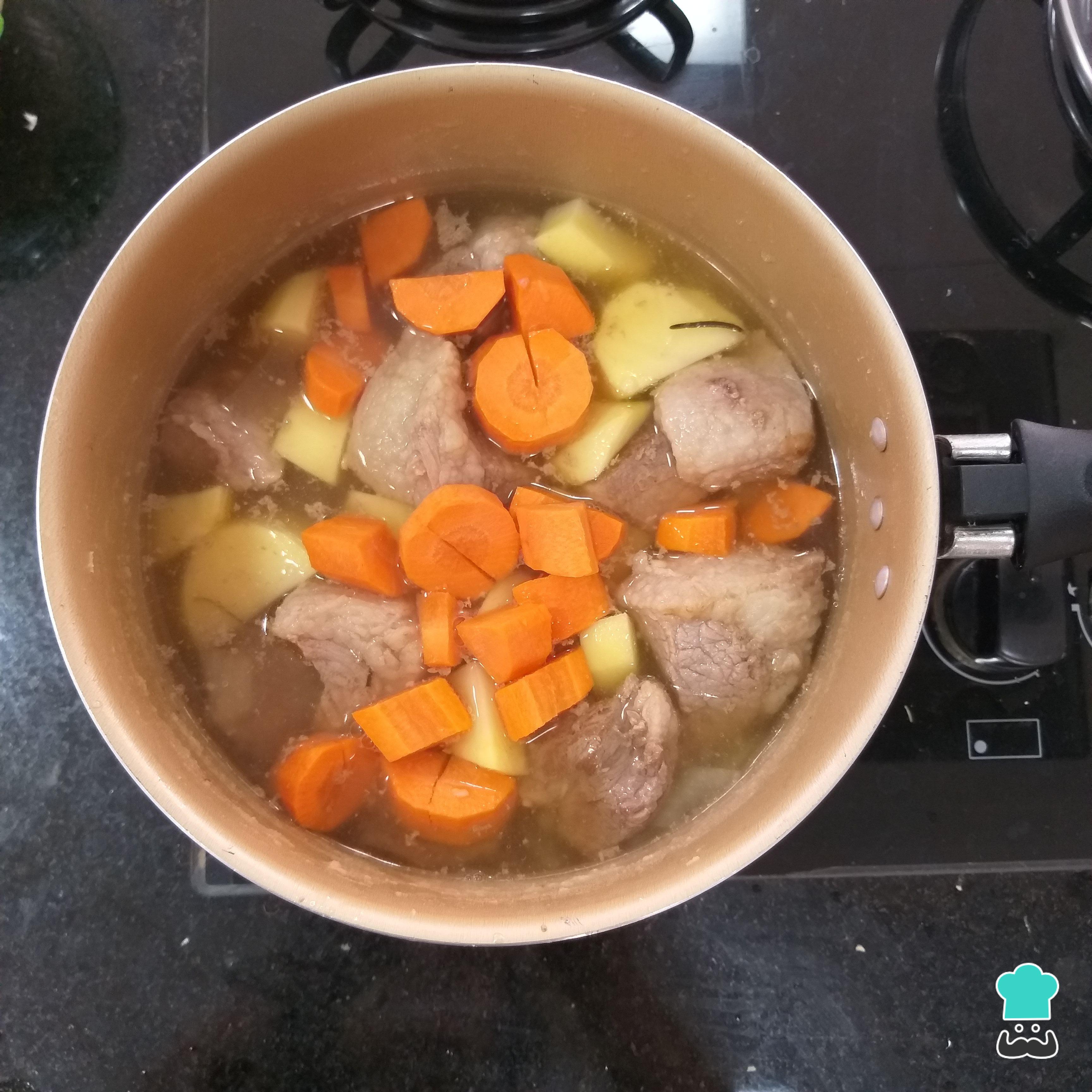Ao fim desse tempo adicione as batatas, a cenoura e o sal. Misture bem e deixe cozinhar até que os legumes fiquem macios também.