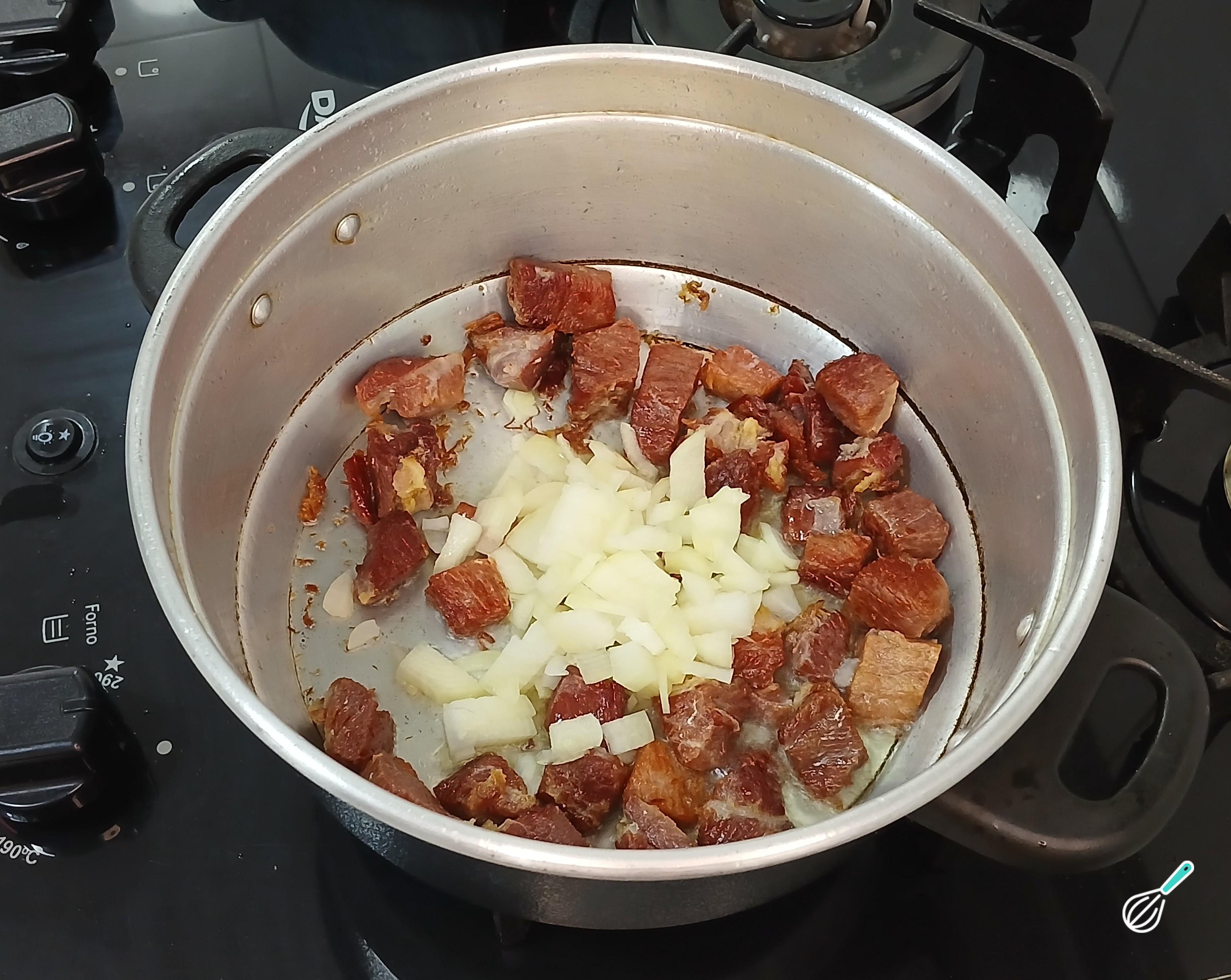 Em uma panela, coloque o óleo e, em seguida, adicione a carne de sol e a cebola branca para refogar. Refogue até que fiquem douradas. Adicione os temperos indicados e misture tudo muito bem.