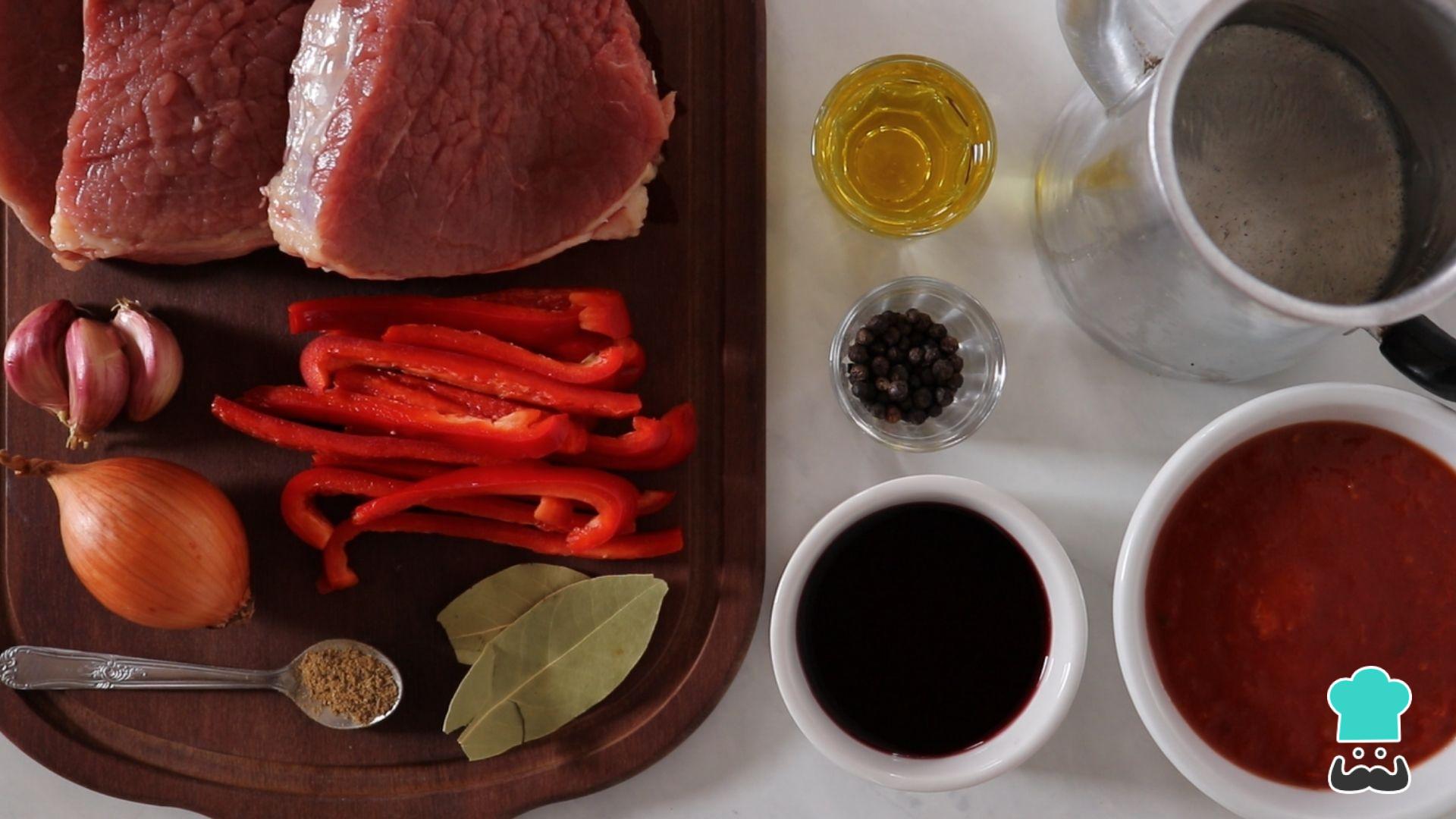 Separe os ingredientes. Corte o pimentão em tiras, pique a cebola e o alho e corte a carne em tamanhos iguais para cozinharem uniformemente.