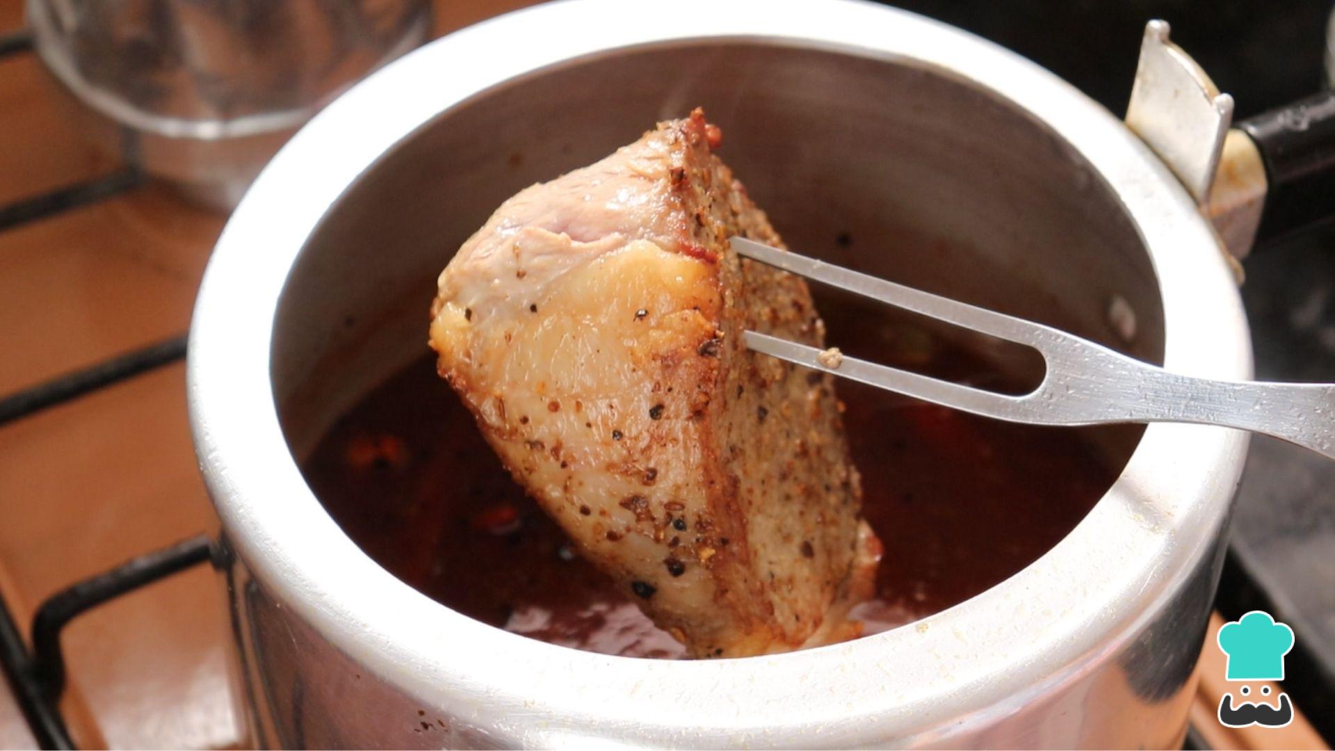 Volte os pedaços de carne para a panela, tampe e deixe cozinhar por 1h40 contados a partir do momento que a panela apitar.