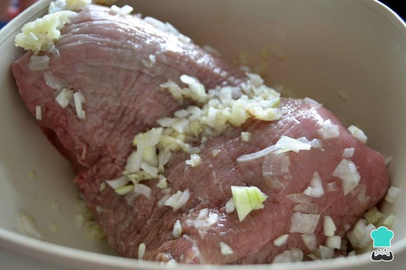 O primeiro passo da receita de carne louca é misturar todos os temperos sólidos respetivos (com exceção do tablete de caldo) em uma tigela e envolver muito bem a carne neles.