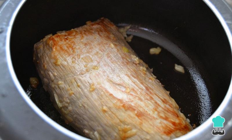 Adicione agora o vinho, o tablete de caldo e água até cobrir a carne. Cozinhe a carne louca tampada durante cerca de 1h30m, para ficar bem mole.
