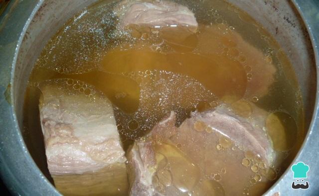Passado esse tempo, retire a carne e reserve o caldo. Deixe esfriar e, depois, desfie ou corte em fatias bem finas. Reserve.