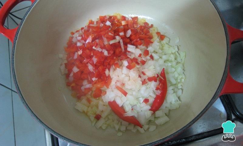 Prepare agora o molho da carne louca: comece por picar as cebolas, os tomates, os pimentões e as azeitonas. Leve a refogar no azeite as cebolas e os pimentões e, quando estiverem moles, acrescente os restantes ingredientes.