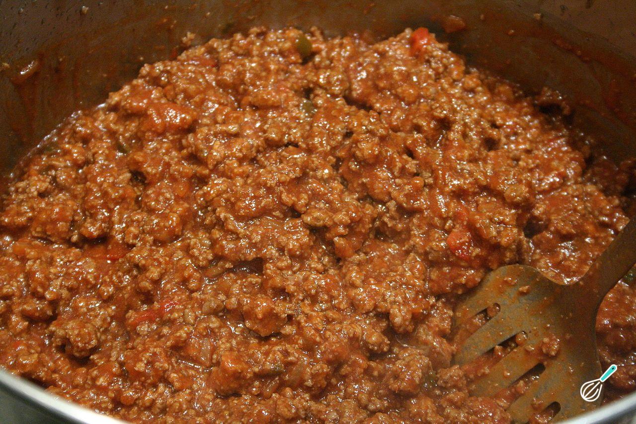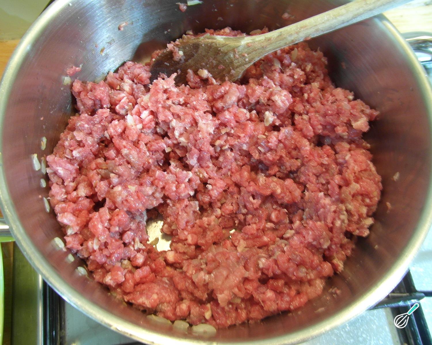 Leve ao fogo uma panela com um pouco de óleo e refogue a cebola nele até ficar macia. Acrescente a carne moída e fique mexendo e desfazendo a carne até mudar de cor. Tempere com páprica, sal e pimenta a gosto.