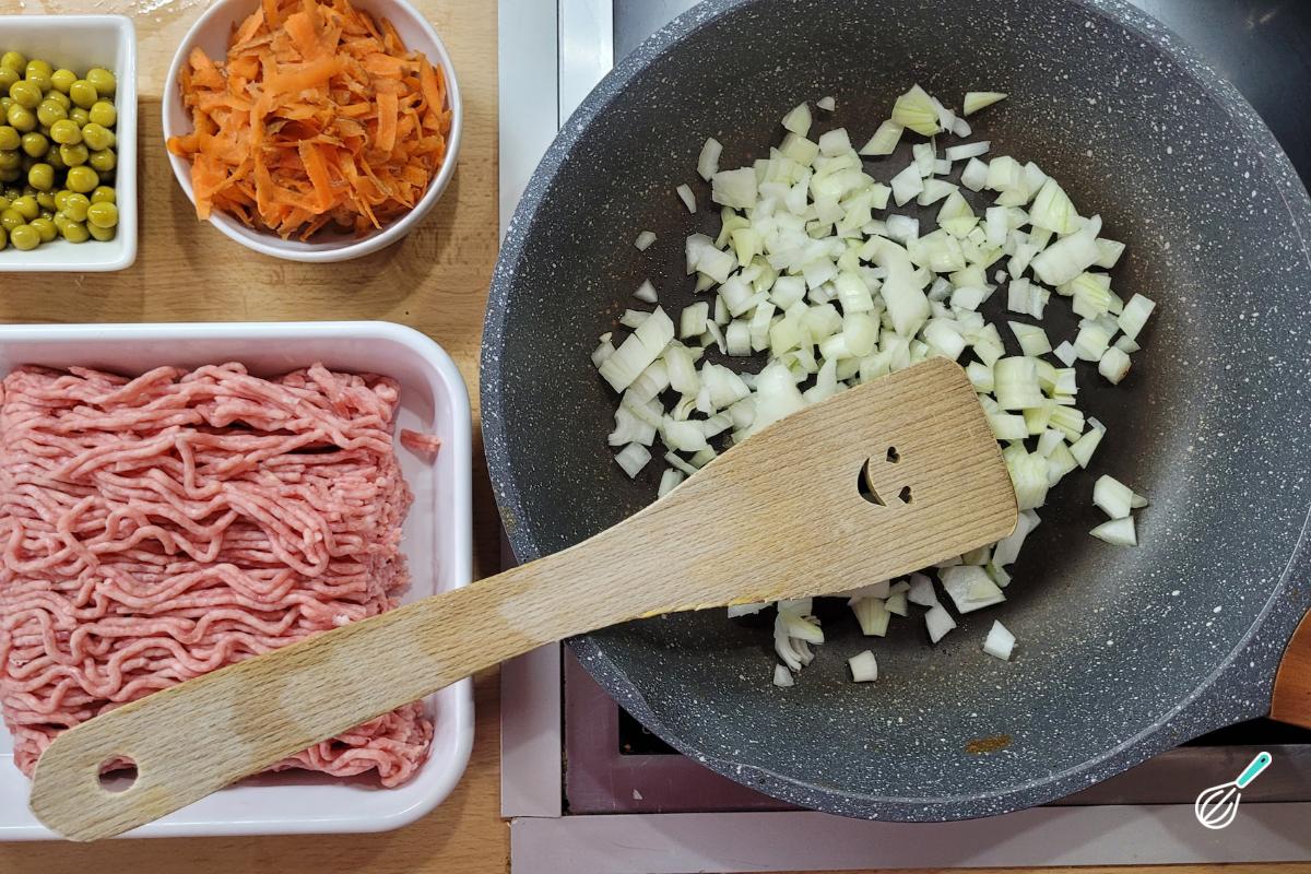 Leve um fio de azeite para esquentar em uma frigideira. Quando esquentar, leve a cebola em cubos para refogar. Tempere com sal para acelerar o processo.