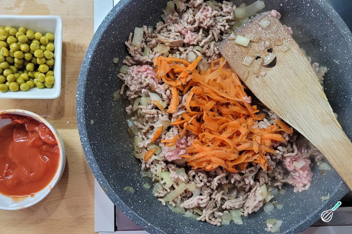 Quando a carne estiver bem dourada, adicione a cenoura e misture.