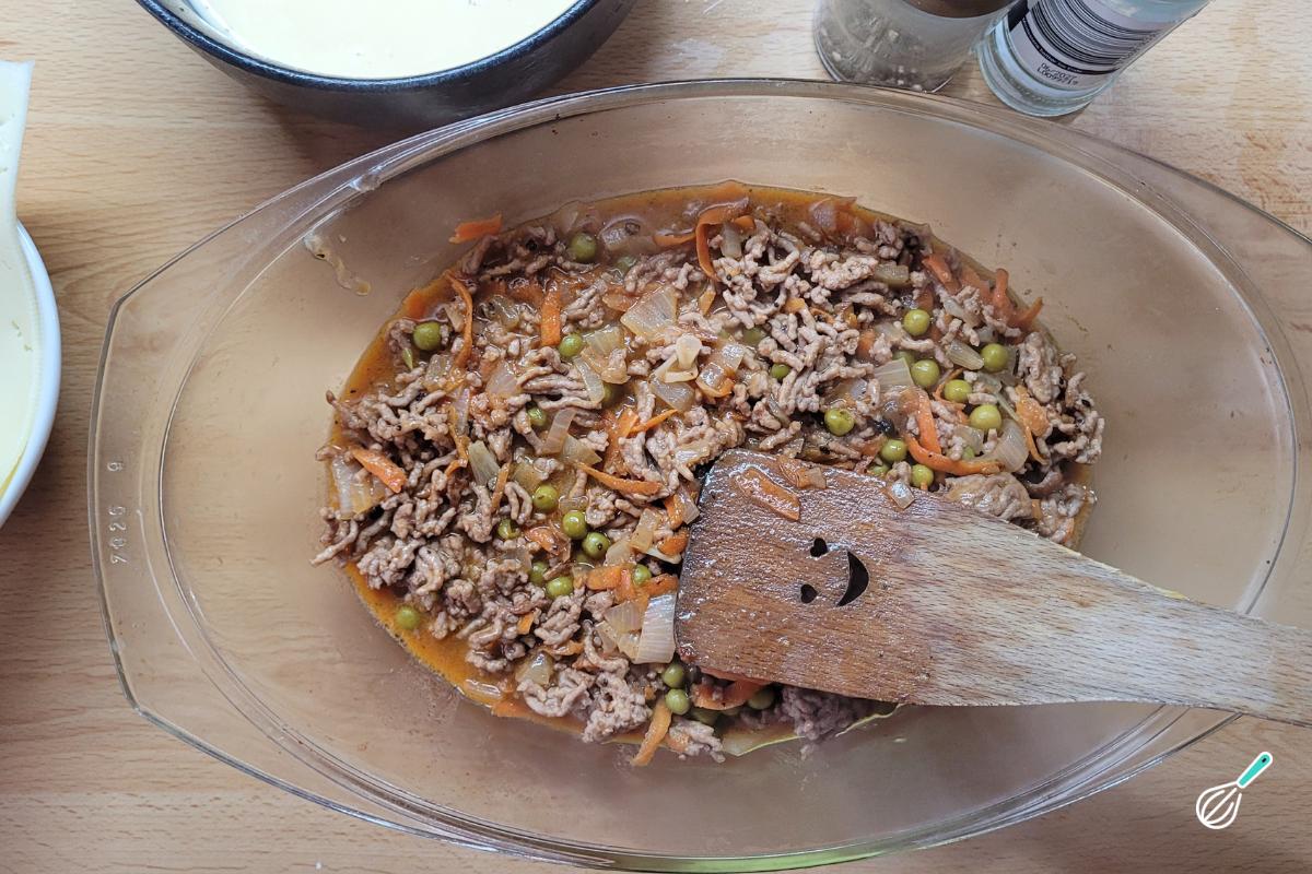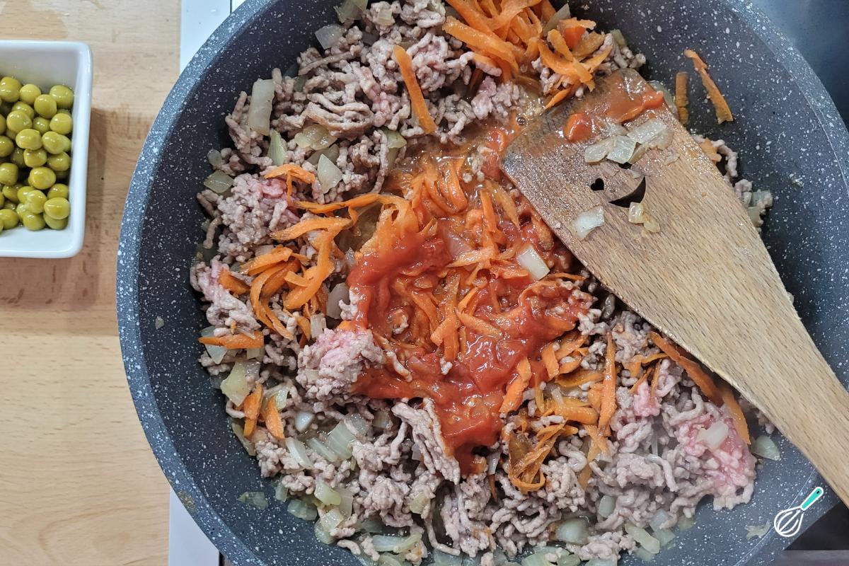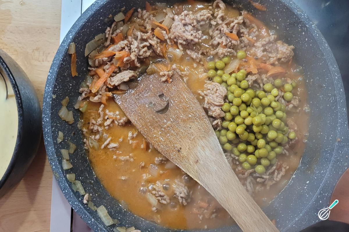 Quando a carne estiver cozida, adicione a ervilha (pode ser em lata ou congelada) e misture.