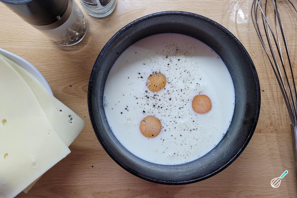 Enquanto isso, prepare a mistura que vai por cima. Em uma tigela, misture os ovos com o creme de leite. Tempere com sal e pimenta do reino e bata bem com um garfo mesmo, apenas para misturar, não precisa incorporar ar.