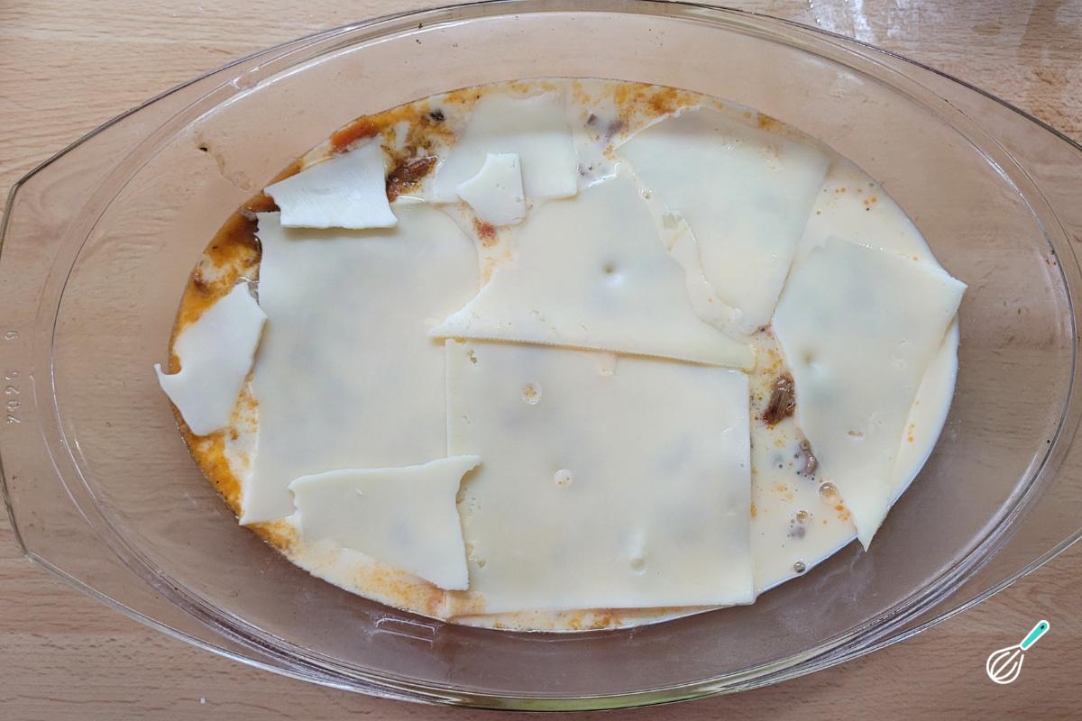 Cubra com o queijo. Aqui usei muçarela fatiada, mas queijo ralado também funciona bem. O importante é que seja um queijo que derreta e gratine, formando uma camadinha crocante. Leve ao forno pré-aquecido a 200oC por 10-15 minutos até que o queijo esteja bem dourado.
