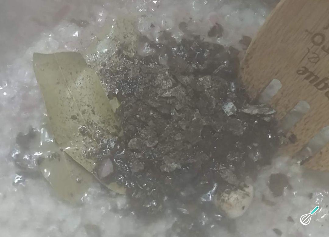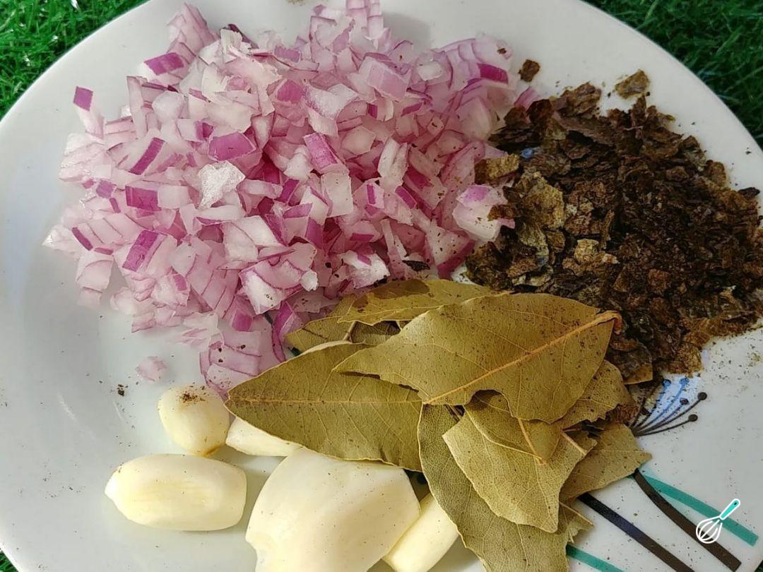 Agora prepare o refogado para carne de soja: leve ao fogo uma panela com o azeite e refogue a cebola e os alhos picados até a cebola ficar macia e transparente. Coloque as folhas de louro e, se quiser, a alga nori também. Deixe cozinhar por 1 minuto, mexendo de vez em quando.