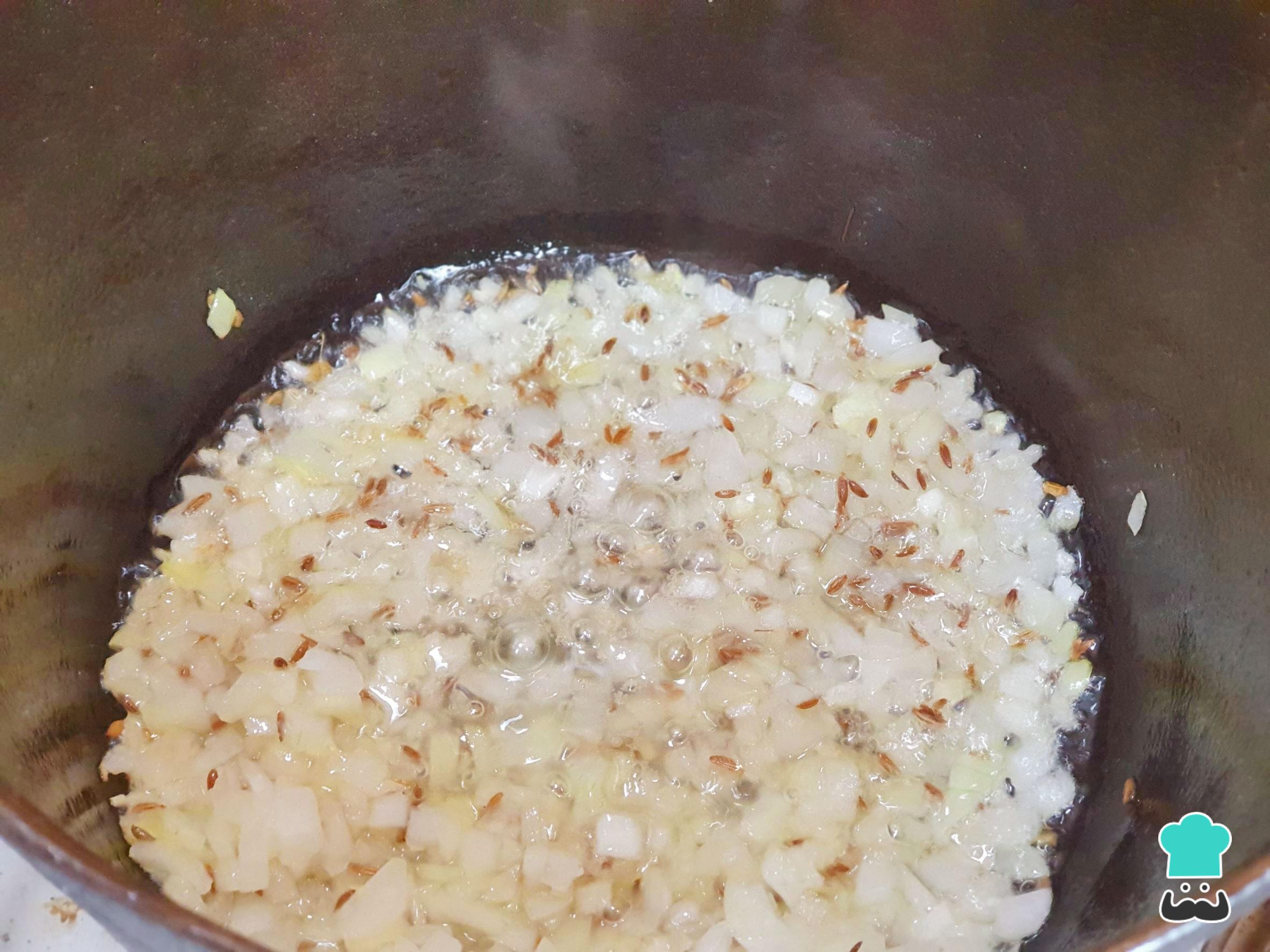 Em uma panela, aqueça o óleo e refogue a cebola juntamente com os grãos de cominho até que a cebola esteja corada.
