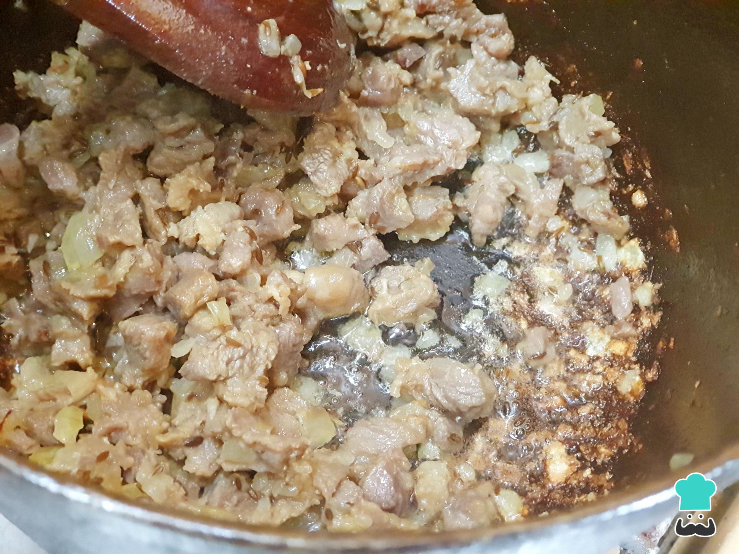 Adicione a carne e refogue tudo muito bem até que ela seque e comece a formar uma crosta no fundo da panela.