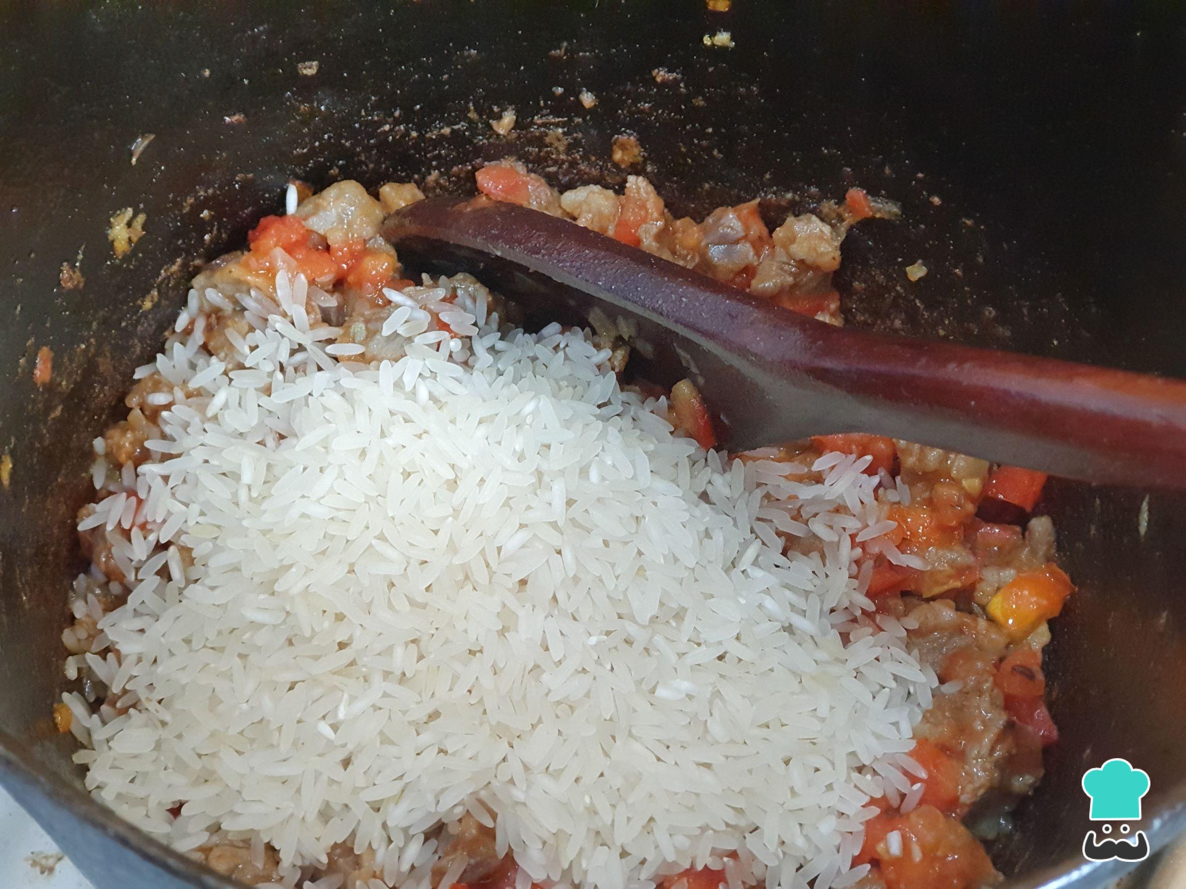Adicione o tomate e mexa muito bem. Assim que o tomate começar a desmanchar, adicione o arroz, incorporando todos os ingredientes.