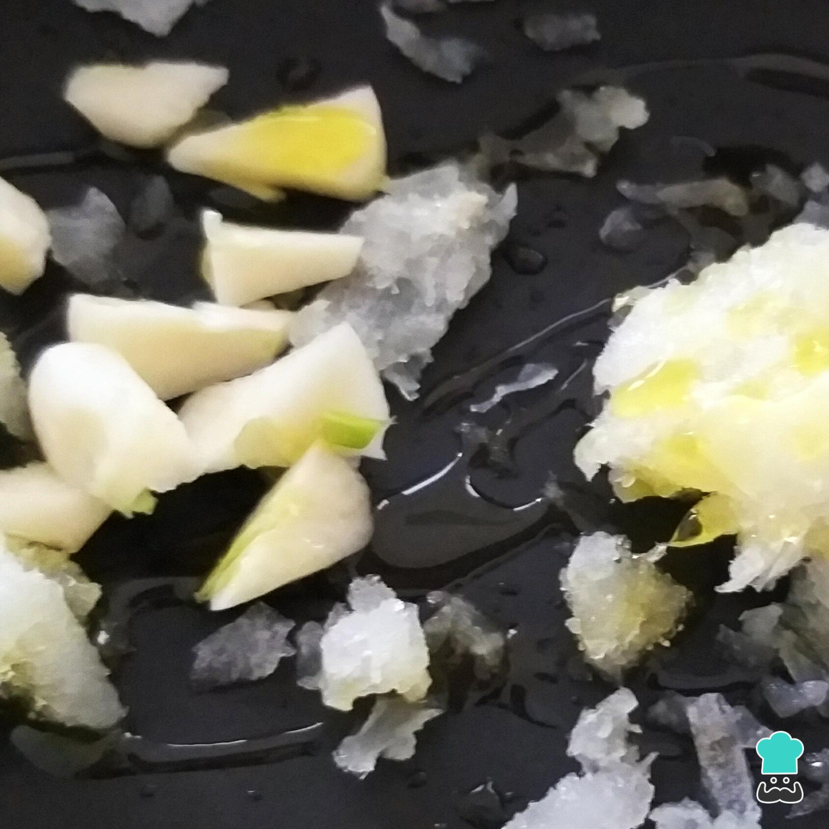 Corte a cebola e o alho e transfira para uma panela ou frigideira. Refogue com o óleo e mexa até dourar.