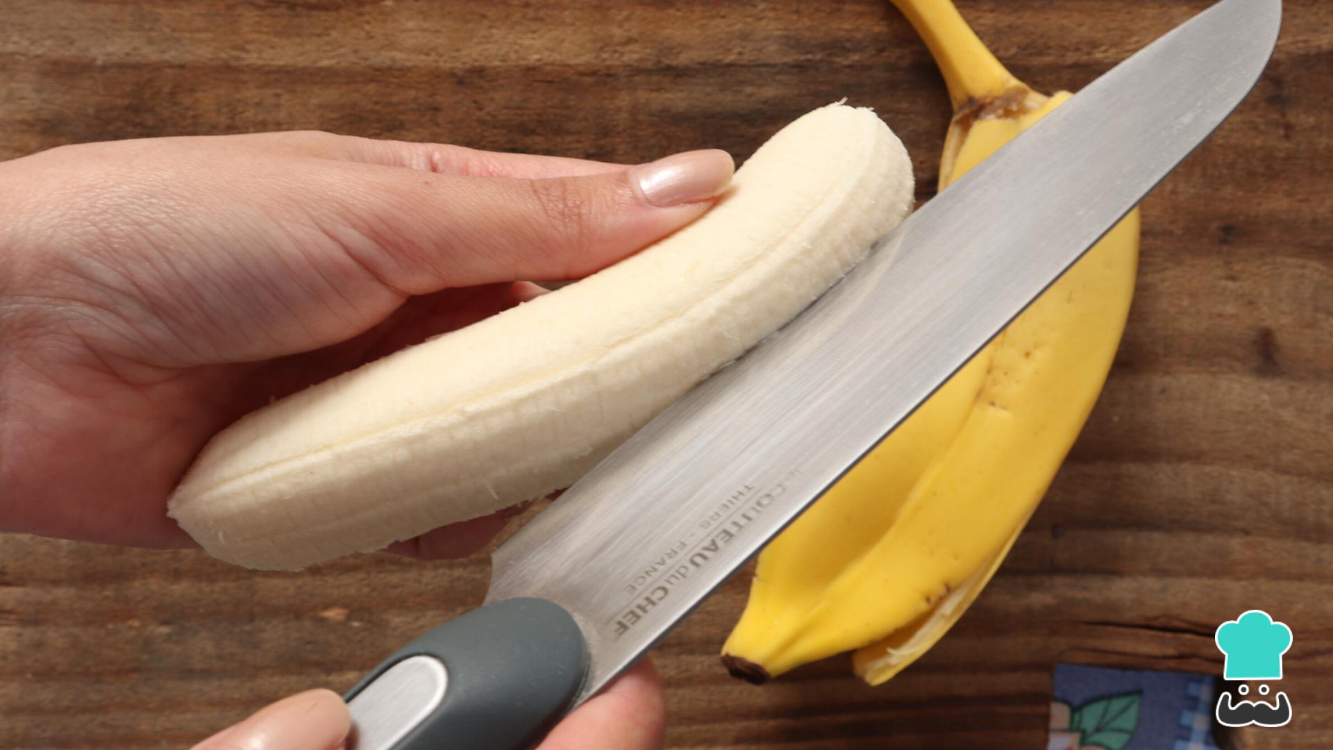 Hora de montar a sua cartola de banana: coloque a primeira fatia de banana frita num prato grande.