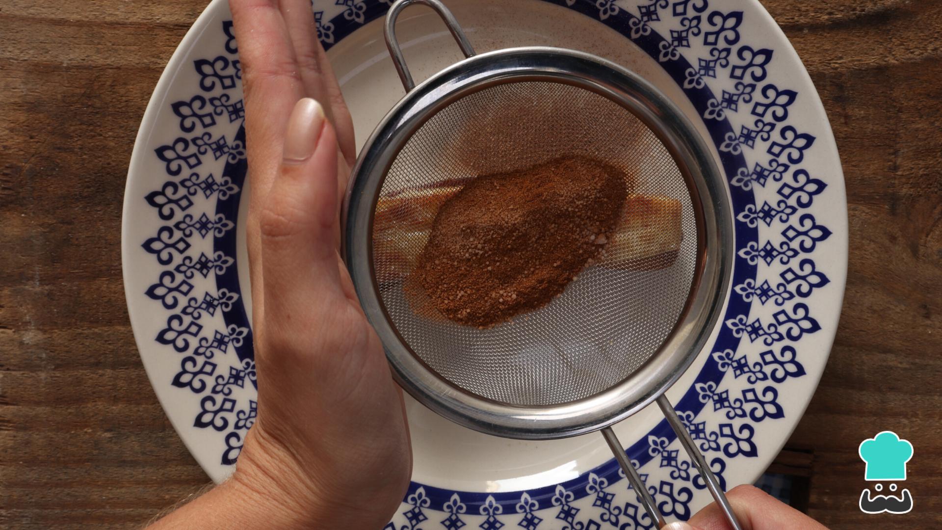 Misture a canela e o açúcar e peneire por cima da sobremesa - lembrando que a quantidade aqui é a gosto. Repita o processo com a outra parte da banana.