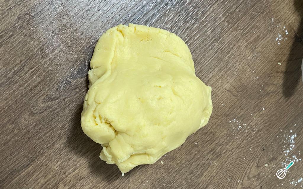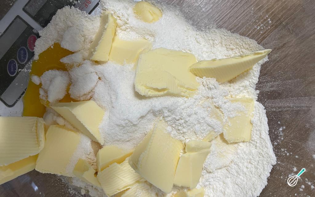 Numa tigela, adicione a farinha de trigo, o açúcar refinado, a manteiga gelada em cubos e a gema.