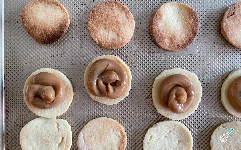 Coloque uma porção de doce de leite em um dos biscoitos.