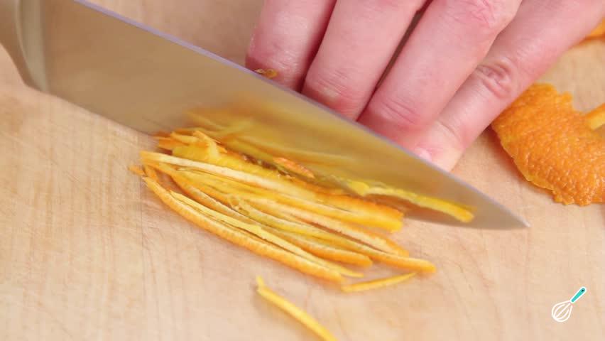 Prepare uma panela com água fria e adicione as tiras de casca de laranja, leve a fogo médio e deixe ferver por 5 minutos. Então, remova, coe e e volte colocar em água fria. Volte a colocar as tirinhas no fogo e deixe ferver por mais 5 minutos. Repita esta operação por 4 vezes.