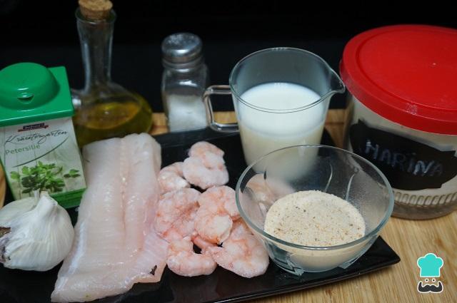 Reúna os ingredientes necessários ao preparo desta receita de casquinha de siri. Se você estiver usando tilápia e camarão congelados deixe descongelar antes de começar cozinhando. O leite e o ovo também deverão estar em temperatura ambiente.