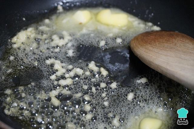 Leve ao fogo uma panela com a manteiga e o azeite de oliva e refogue os alhos picadinhos até começarem a dourar.