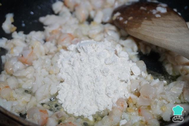 Seguidamente coloque a farinha e mexa para que se misture com os demais ingredientes. A farinha vai ajudar a conseguir um recheio para casquinha de siri mais cremoso e espesso.