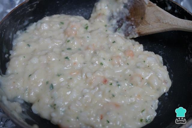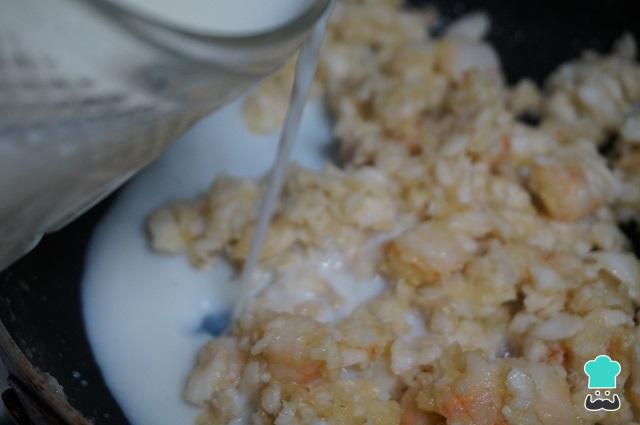 Adicione o leite pouco a pouco enquanto mistura os ingredientes na panela. À medida que coloca o leite e mistura você observará que o recheio de camarão e peixe vai ficando mais espesso. Quando terminar de colocar o leite continue mexendo para o recheio ficar bem cremoso.
