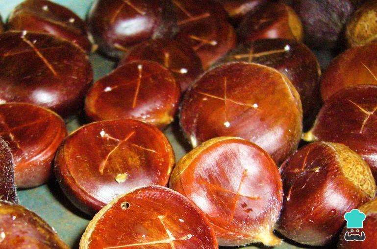 Usando uma faca afiada, realize um corte na base ou na lateral de cada castanha. Isto é necessário para que as castanhas assem bem e não explodam.