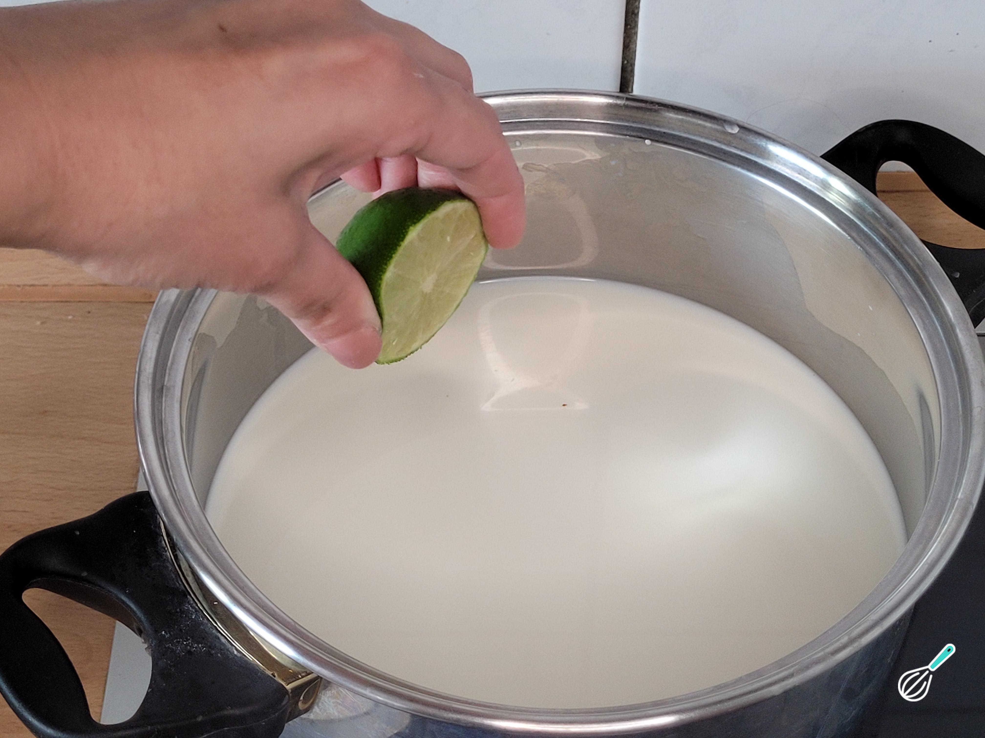 Em uma panela, adicione 1 litro de leite e o suco dos limões ou o vinagre.