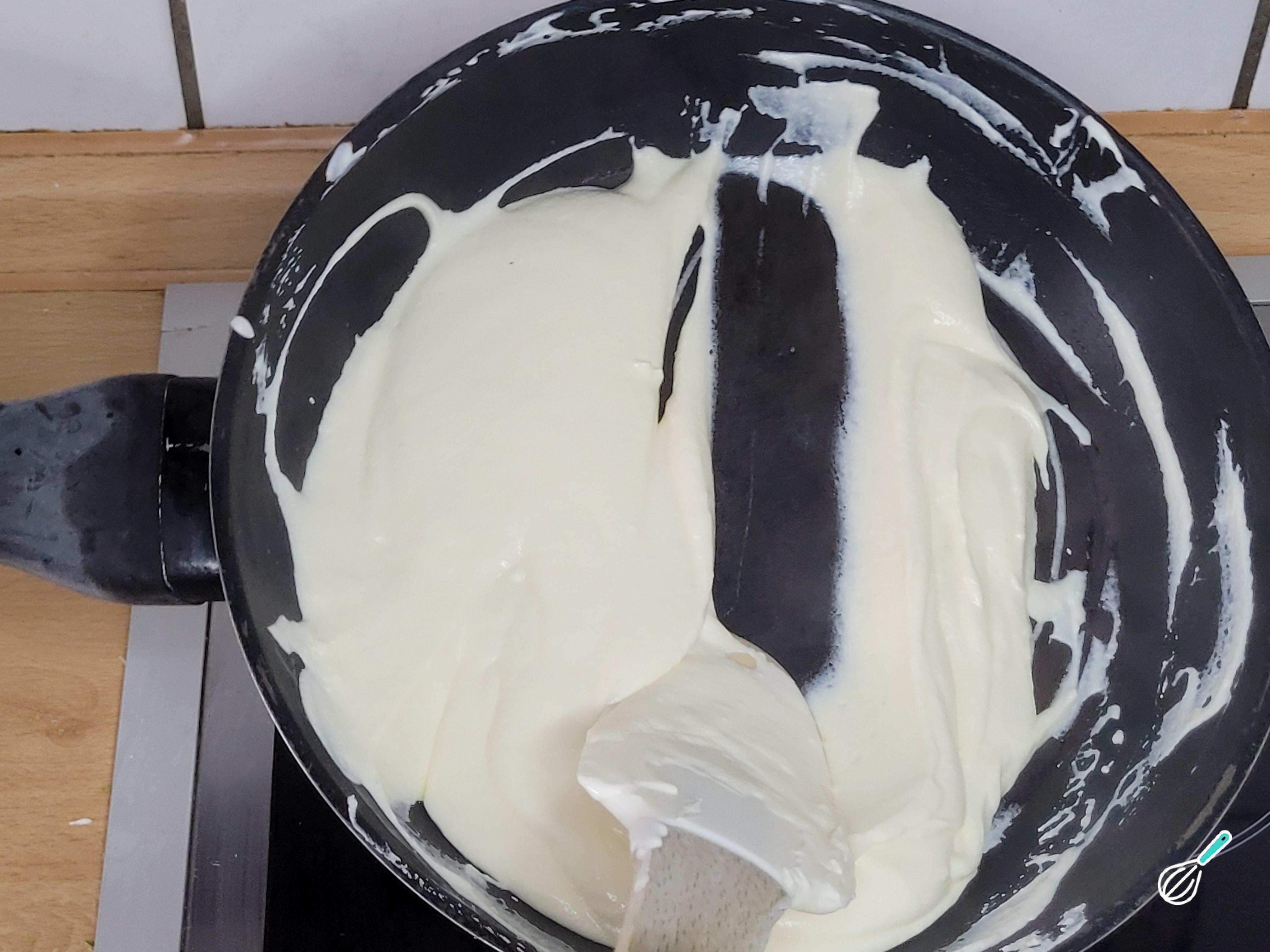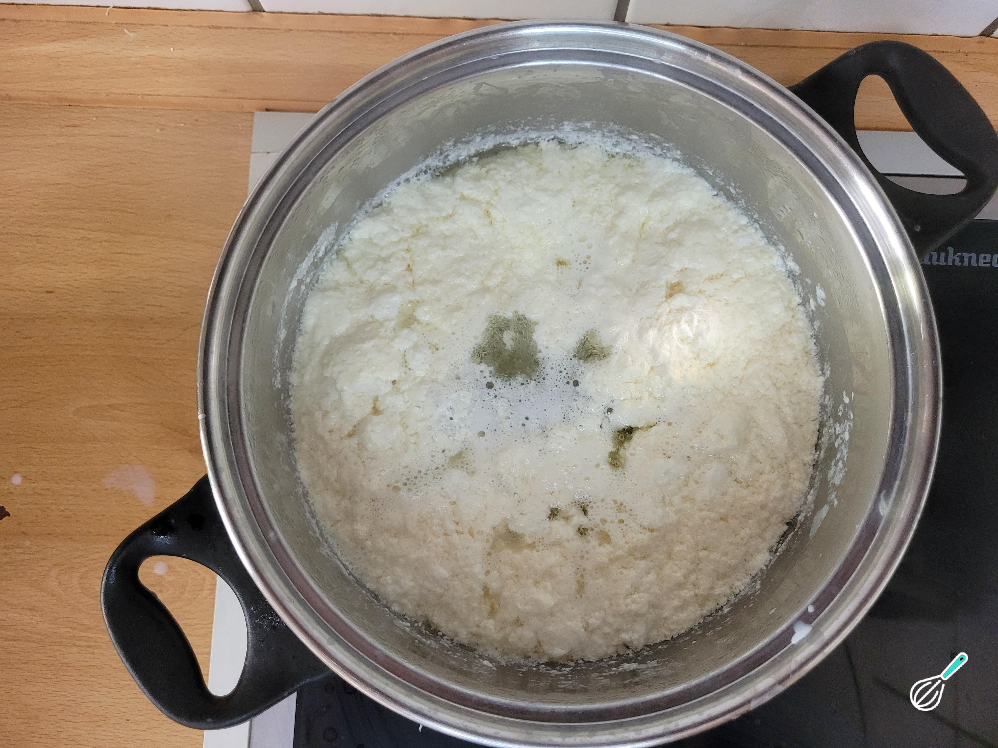 Quando coagular, abaixe o fogo, deixe em fogo baixo por mais uns 5 minutos.