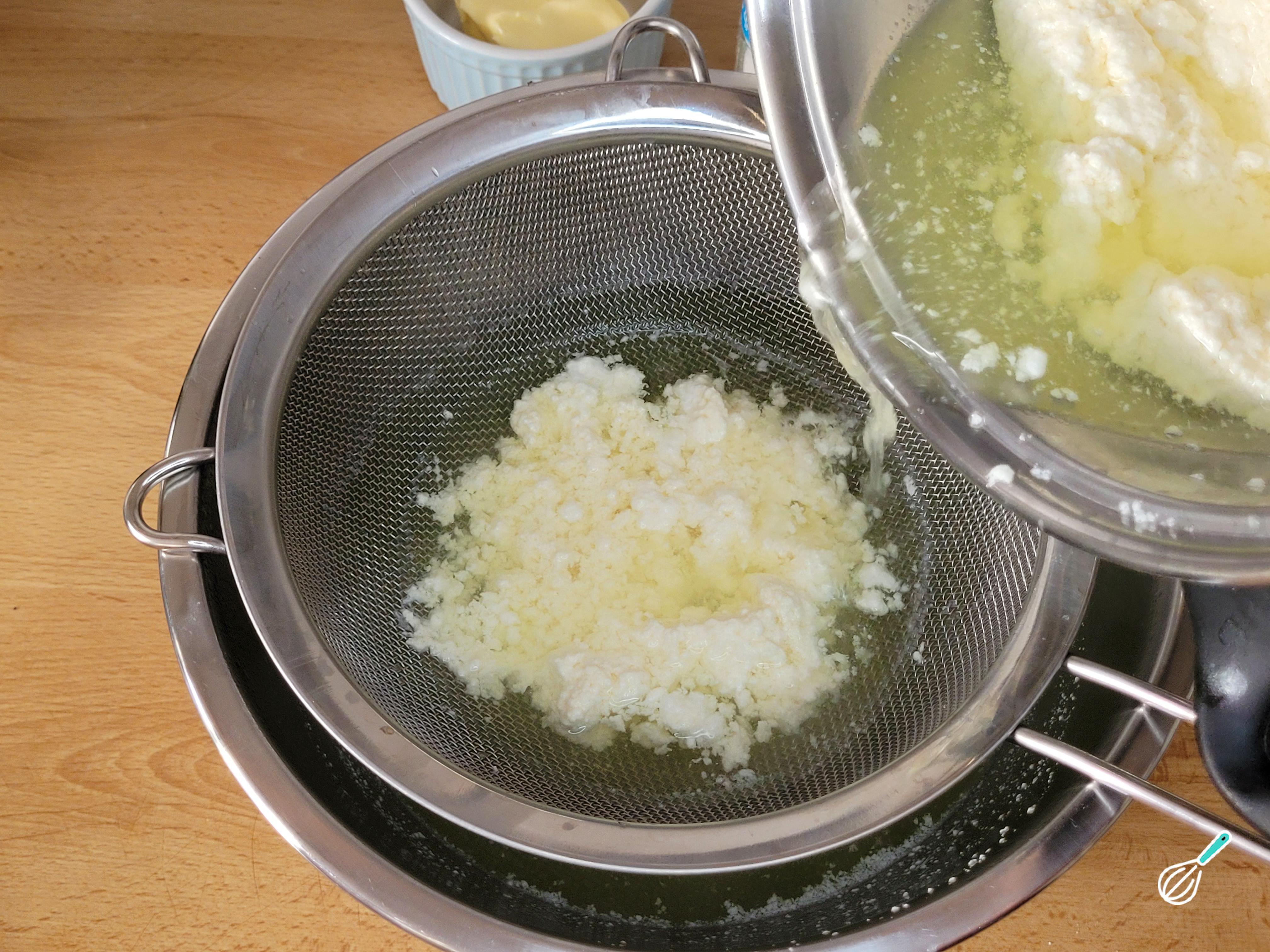 Peneire para separar os sólidos do soro do leite. Nesse ponto, o soro do leite deve estar o mais límpido possível para evitar perdas. Se ainda estiver turvo, é porque nem todos os sólidos coagularam. Volte com o soro para a panela, adicione mais vinagre e limão e repita o processo.