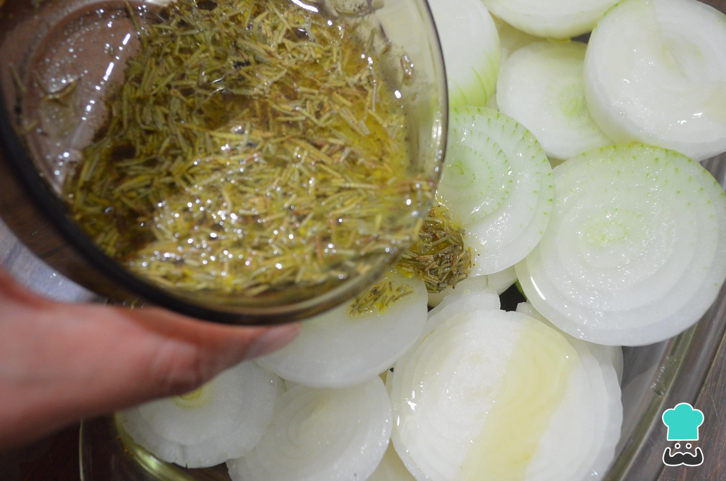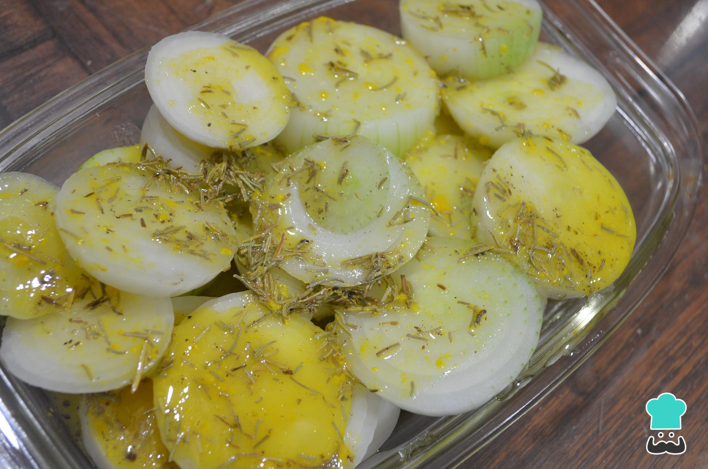 Coloque as rodelas de cebola em uma assadeira e regue-as com o tempero do passo anterior.