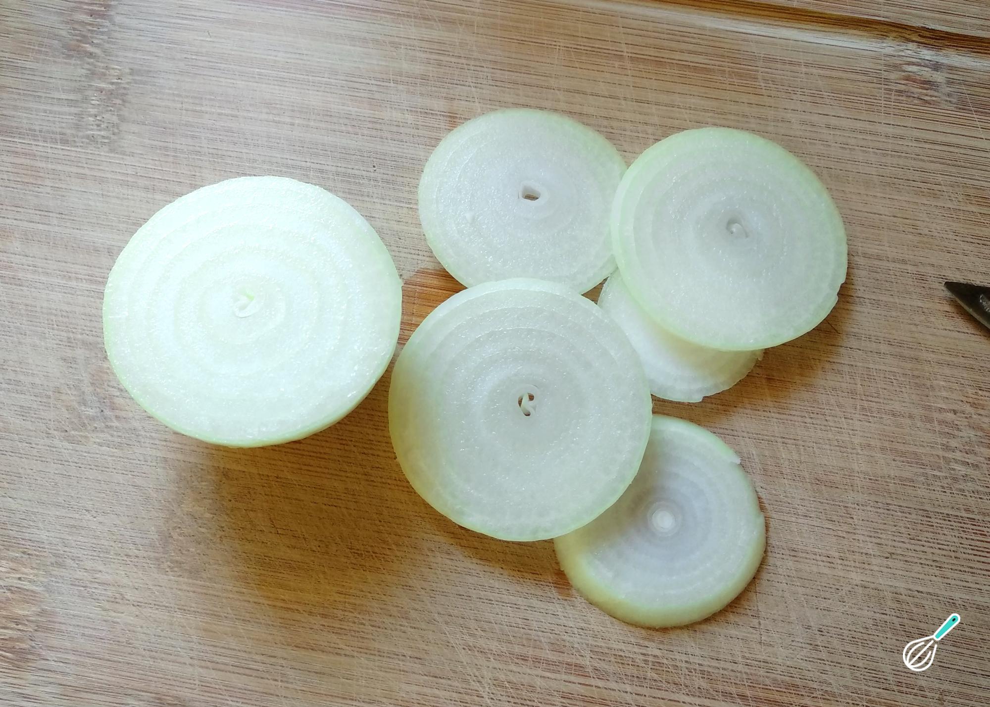 Comece por descascar as cebolas e cortar em rodelas com cerca de 5 mm de espessura, ou seja, nem muito finas nem muito grossas.