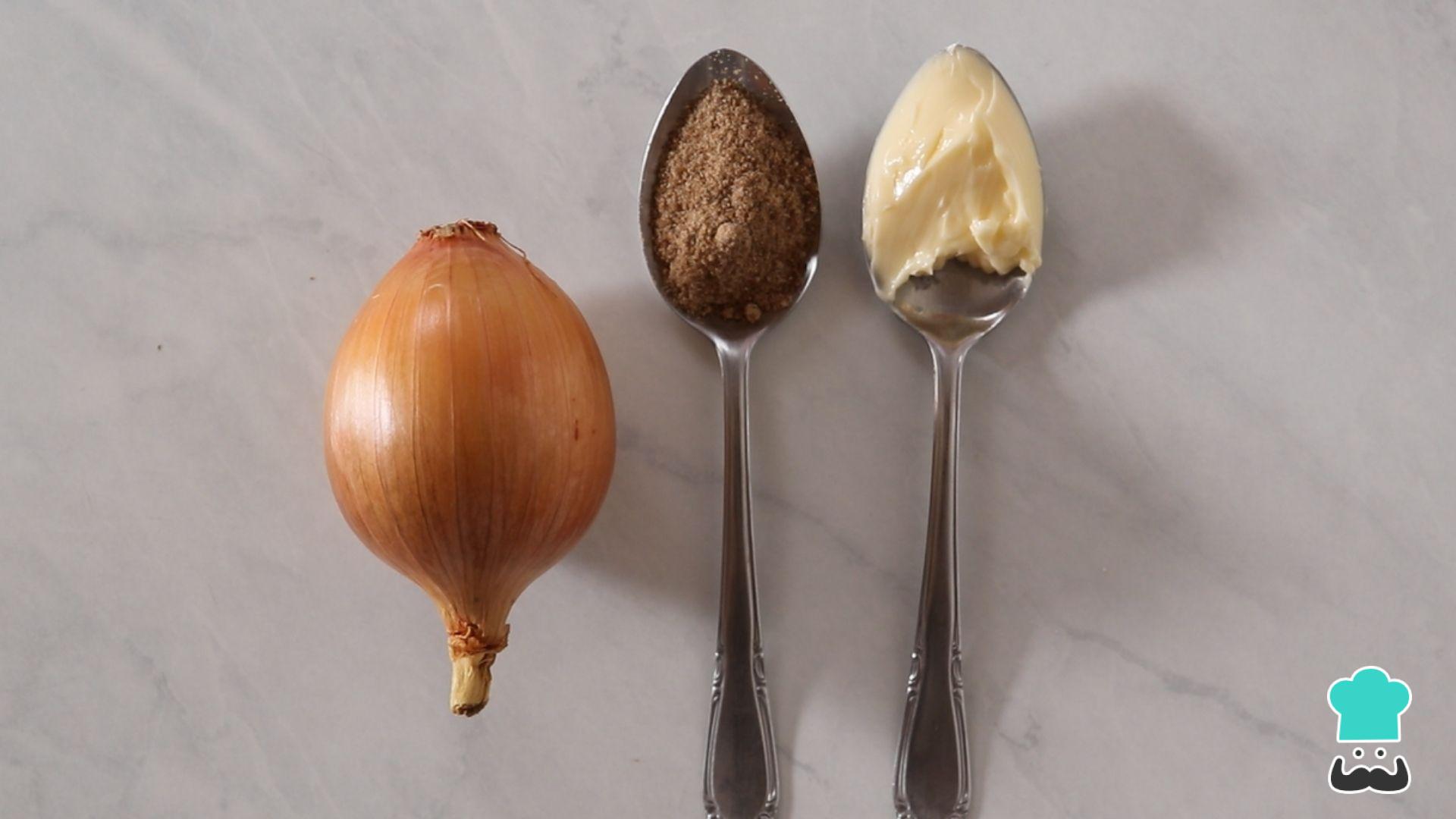 Separe os ingredientes para preparar a cebola caramelizada para lanche.