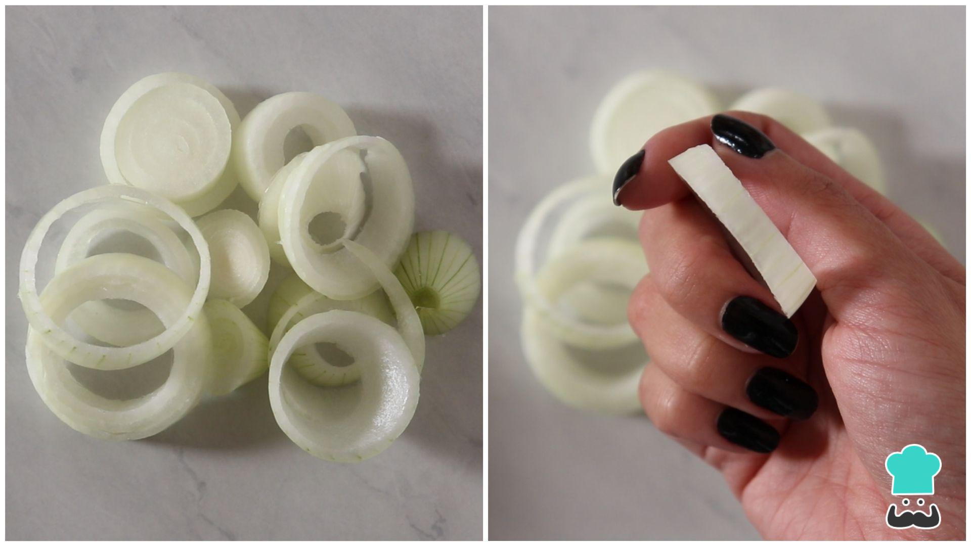 Descasque e corte as cebolas em rodelas em uma espessura média.