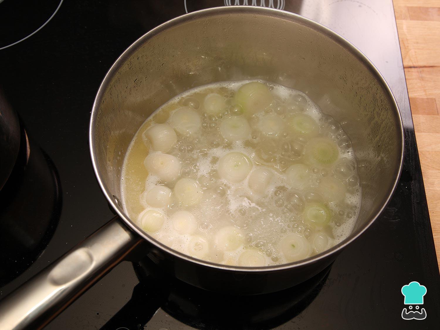 Leve ao fogo médio 2 litros de água. Quando estiver fervendo, desligue o fogo, adicione as cebolinhas e deixe ficar por 3 horas.