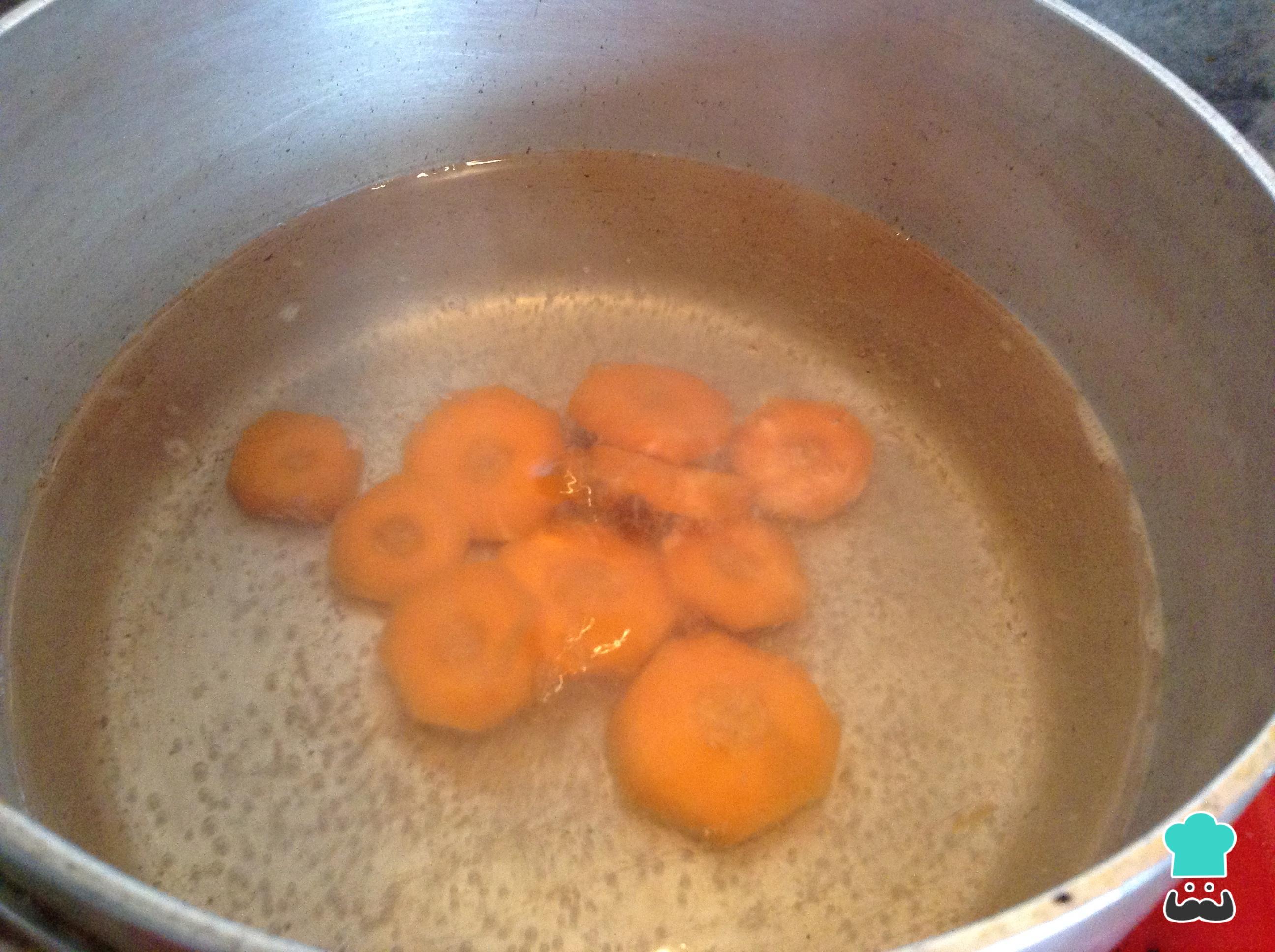 Leve uma panela com água e um pouco de sal ao fogo alto. Assim que estiver fervendo, adicione as cenouras e cozinhe por 5 a 10 minutos.
