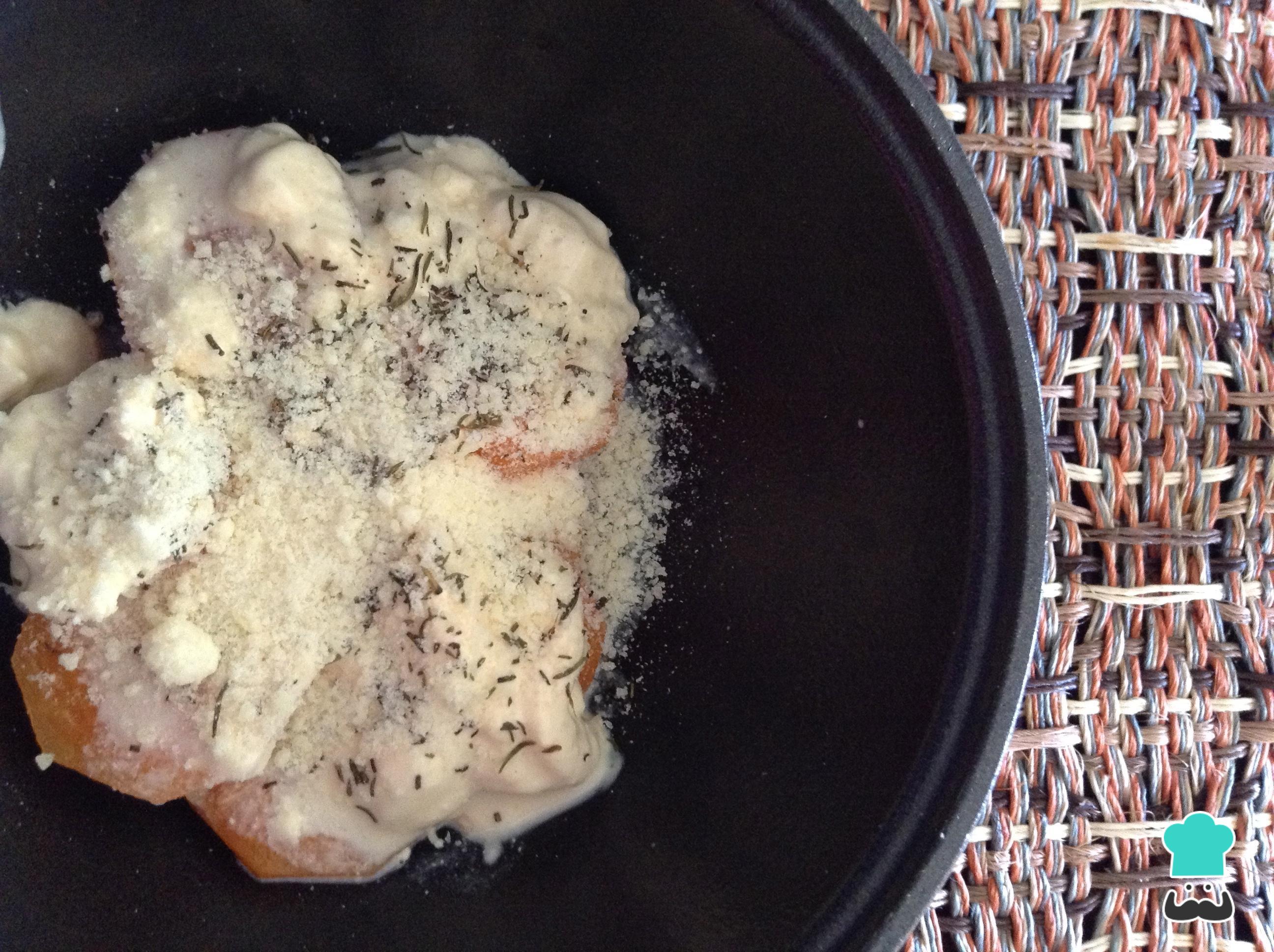 Acrescente o queijo parmesão, tomilho, sal e pimenta a gosto a esta receita de cenouras com creme de leite.