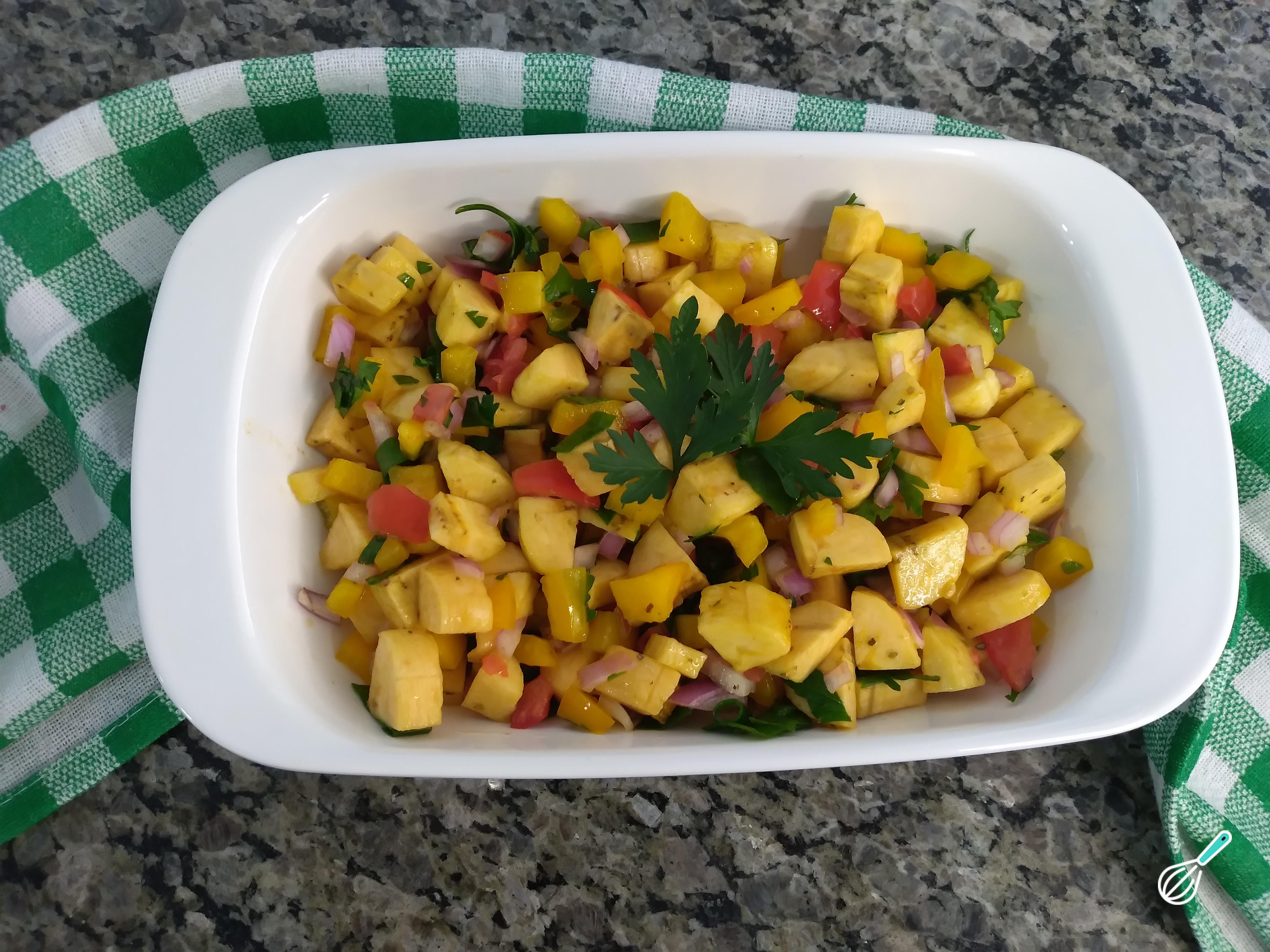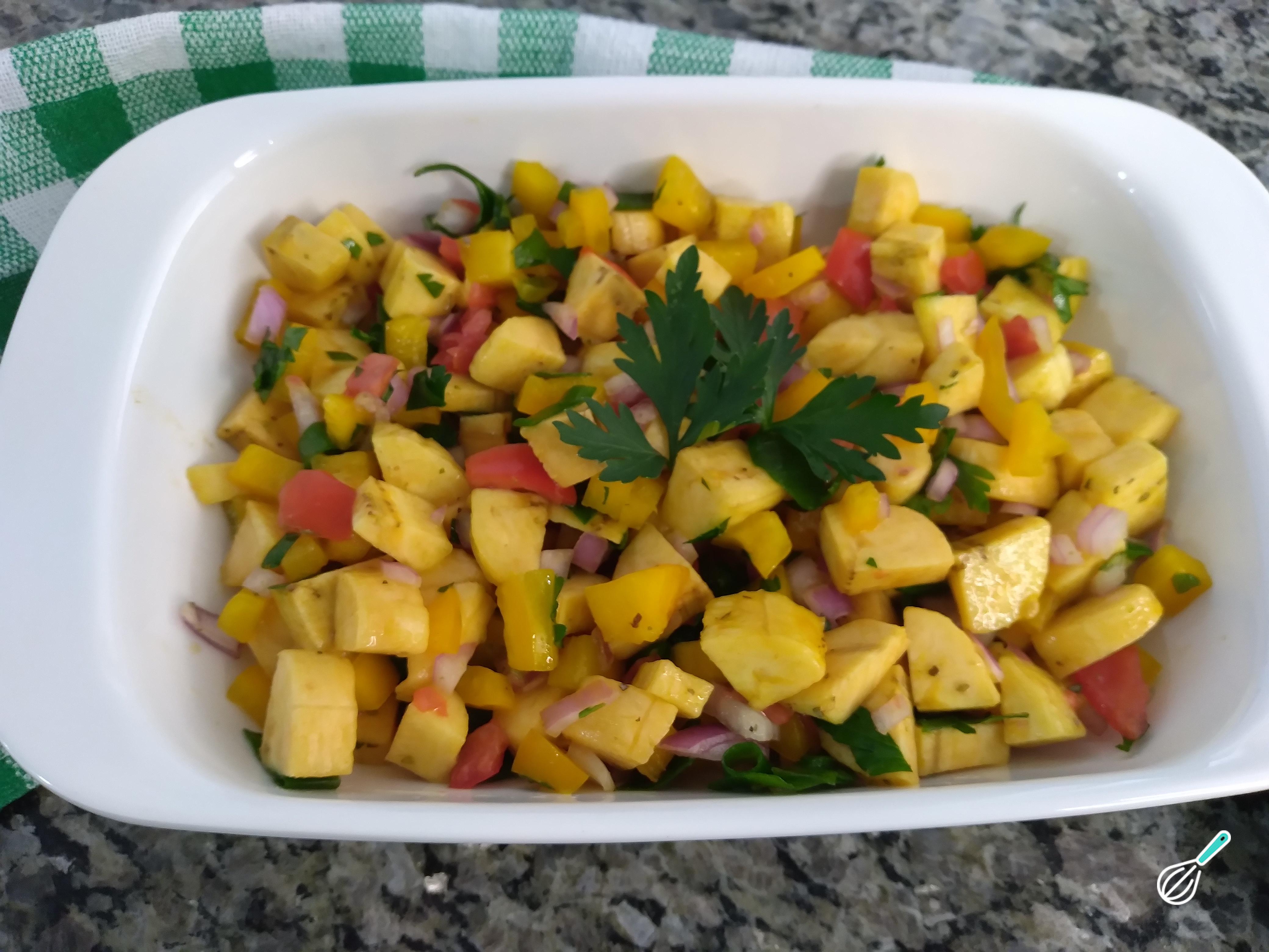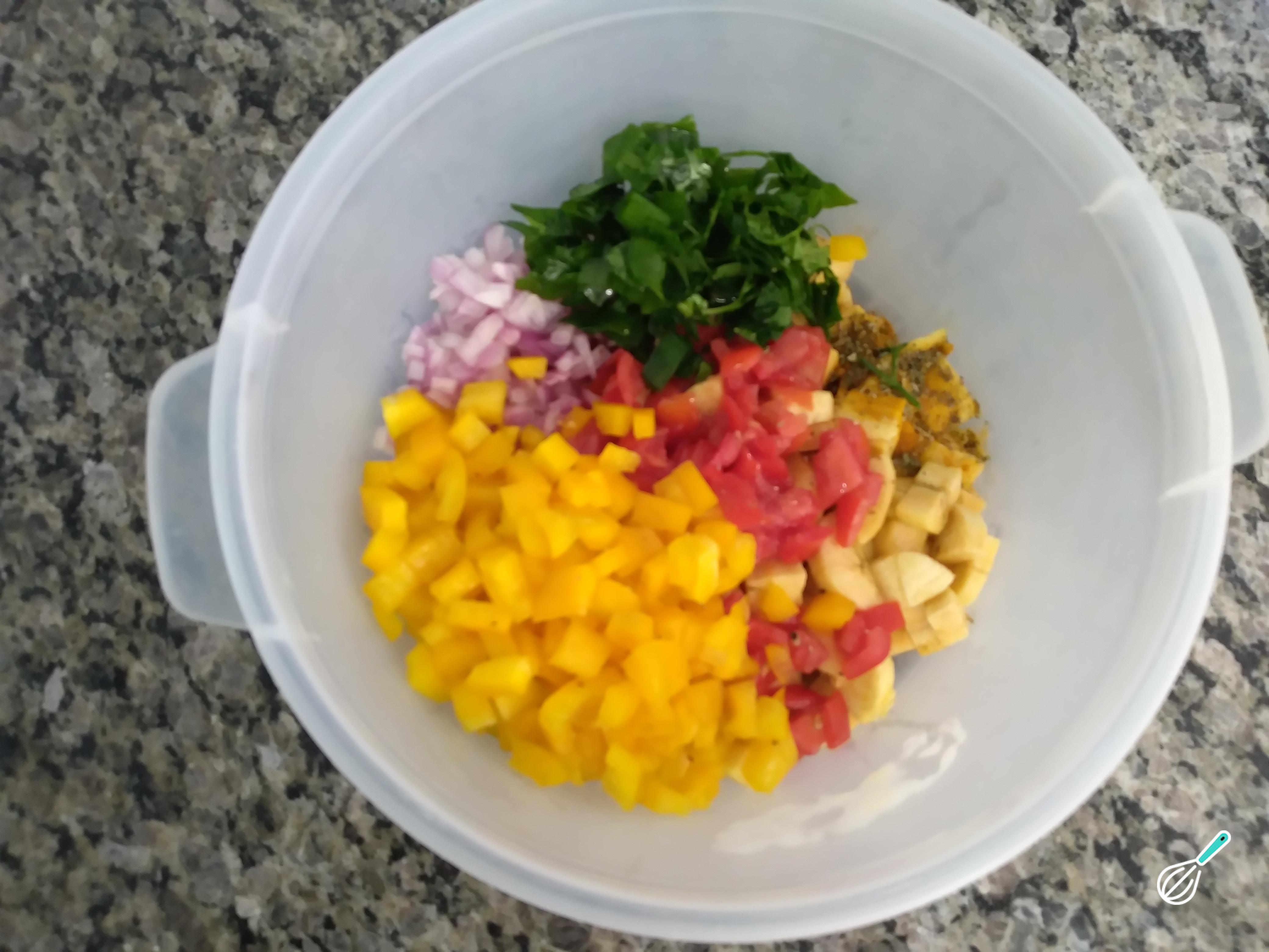 Numa vasilha, coloque todos os ingredientes e mexa delicadamente. Esse passo é muito simples, mas deve ser feito com cuidado. Para manter a textura dos ingredientes, sem quebra-los, principalmente a banana que é delicada. O pimentão amarelo, pode ser substituído pelo vermelho. Como temos tomate na preparação, a escolha do pimentão amarelo, foi por estética.